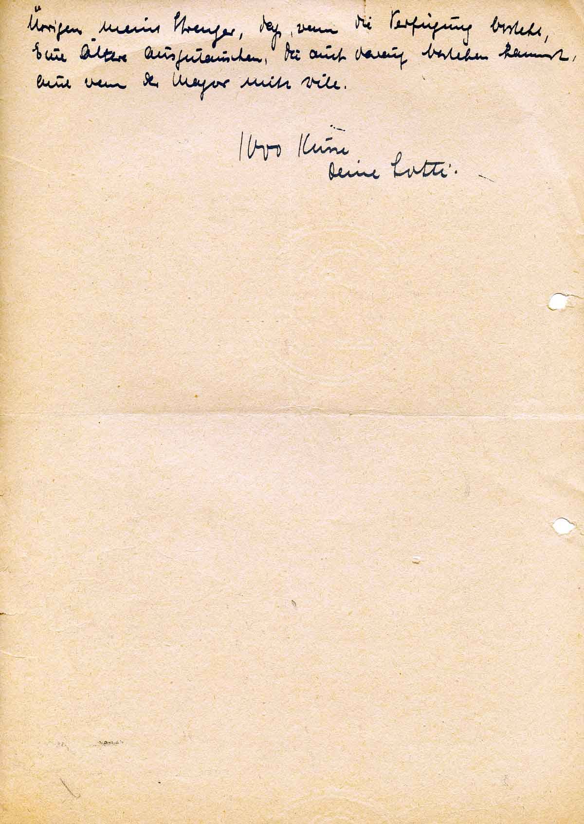 Weisst Du, Liebster, ich habe ja immer wieder Mut, aber dies ist ein bisschen viel. Bitte, schreibe mir wenigstens Briefe, denn das ist wirklich und wahrhaftig noch die einzige Freude, die ich habe, sonst habe ich nichts mehr. Du hast bei aller Arbeit wenigstens einen freien Nachmittag in der Woche, aber bei mir reisst es jetzt schon seit Wochen überhaupt nicht ab und ich kenne weder einen freuen Nachmittag noch einen freien Abend.