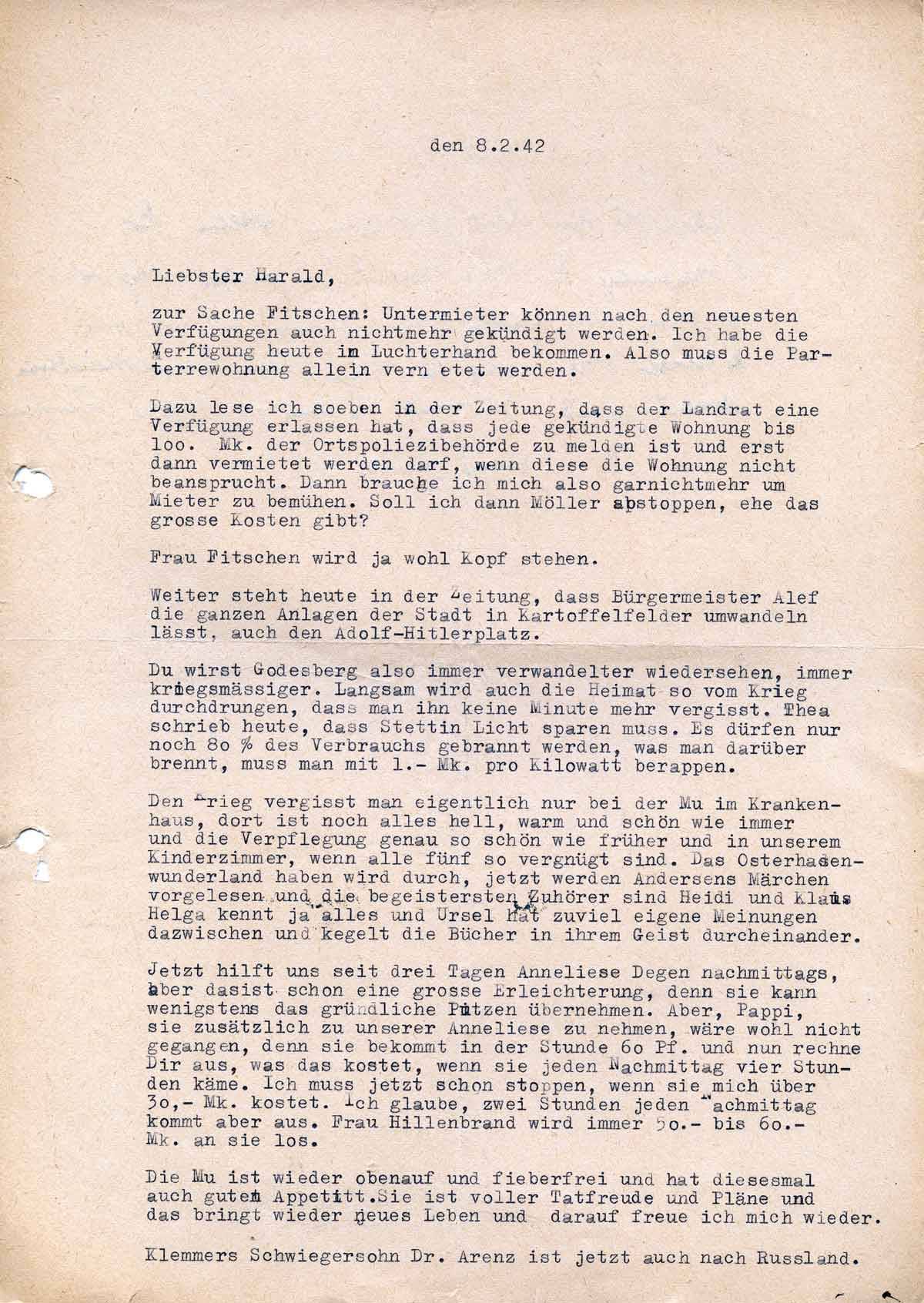 Charlotte Endemann an ihren Mann Harald, 8. Februar 1942