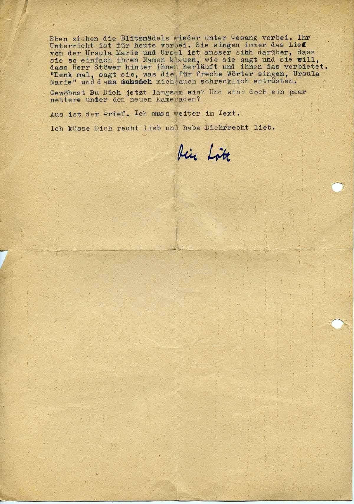 Eben ziehen die Blitzmädels unter Gesang vorbei. Ihr Unterricht ist für heute vorbei. Sie singen immer das Lied von der Ursula Marie, und Ursel ist außer sich darüber, dass sie so einfach ihren Namen klauen, wie sie sagt, und sie will, dass Herr Stöwer hinter ihnen herläuft und ihnen das verbietet. „Denk mal, sagt sie, was die für freche Wörter singen, Ursula Marie“ und dann muss ich mich auch schrecklich entrüsten
