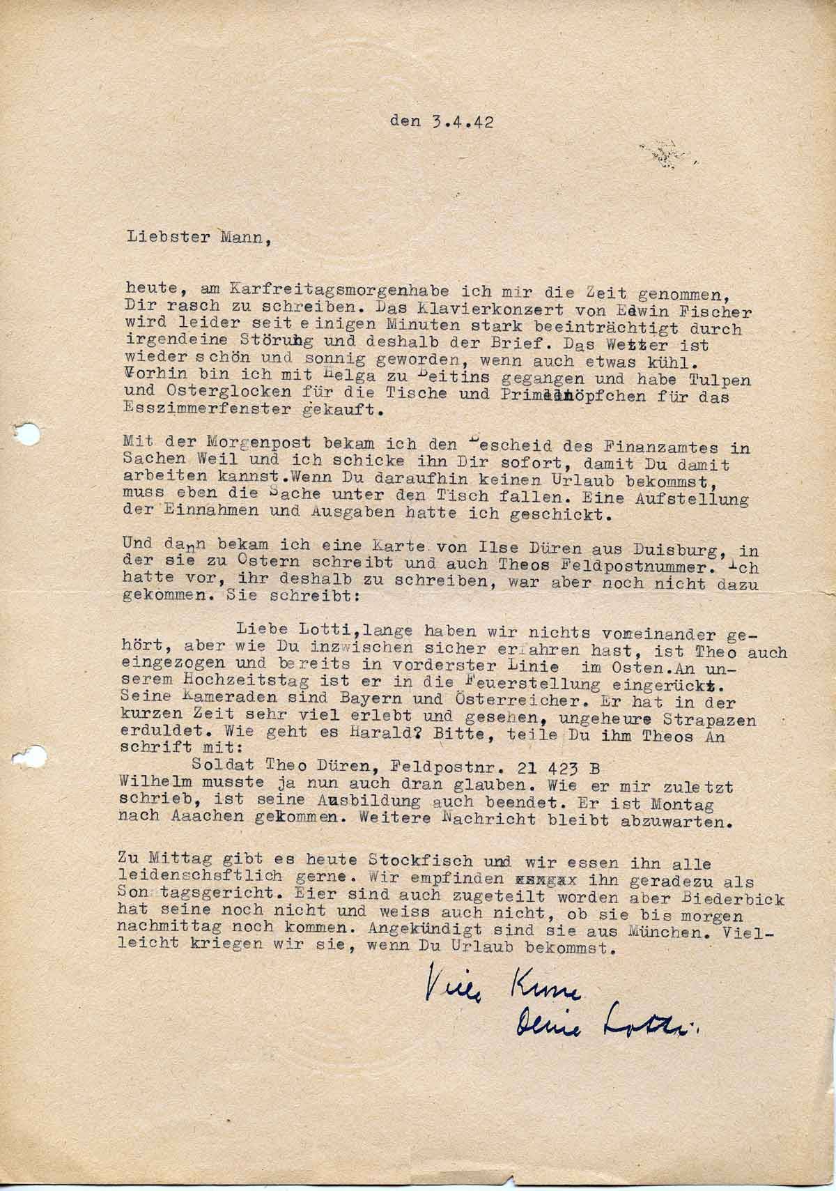 Charlotte Endemann an ihren Mann Harald, 3. April 1942