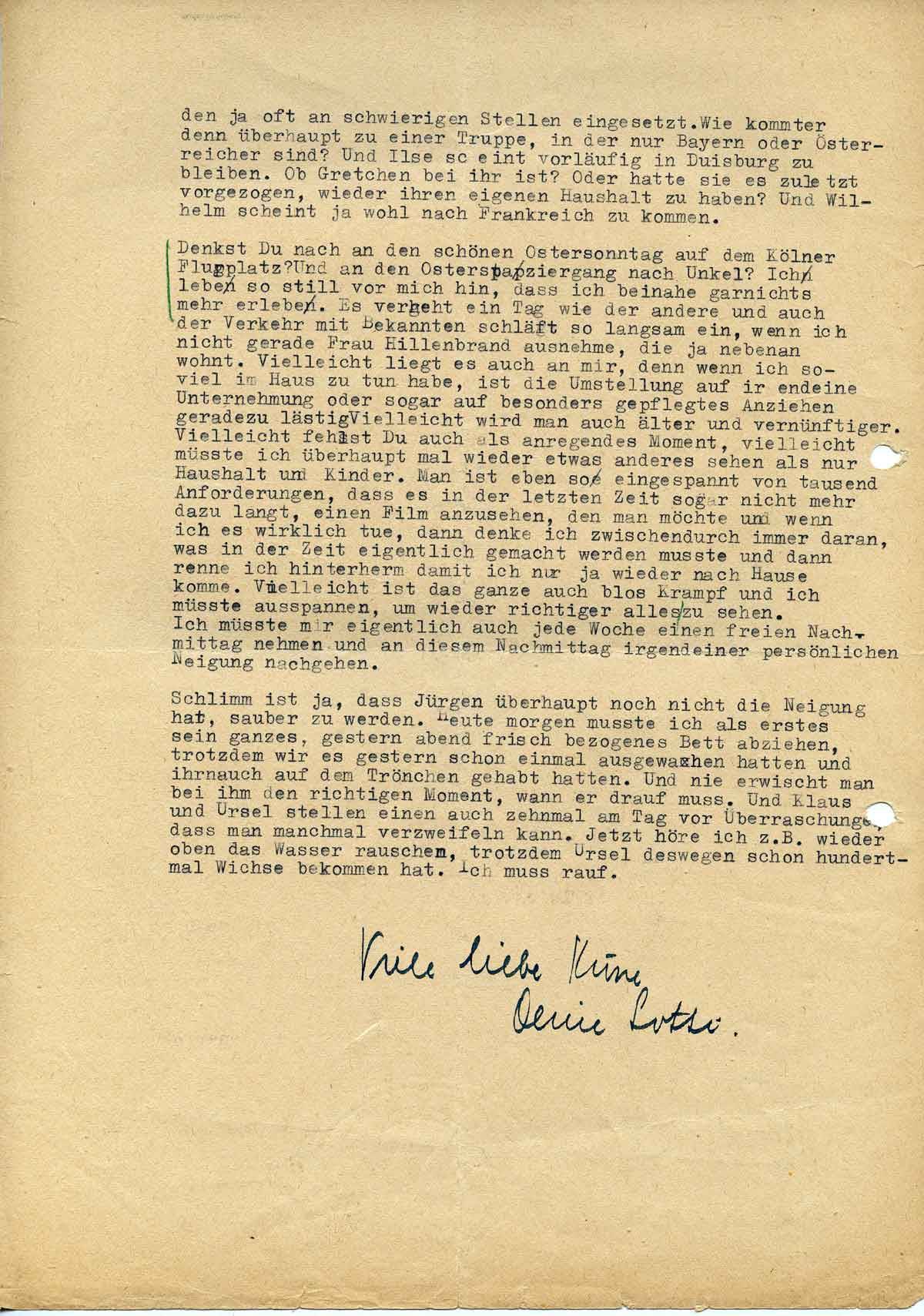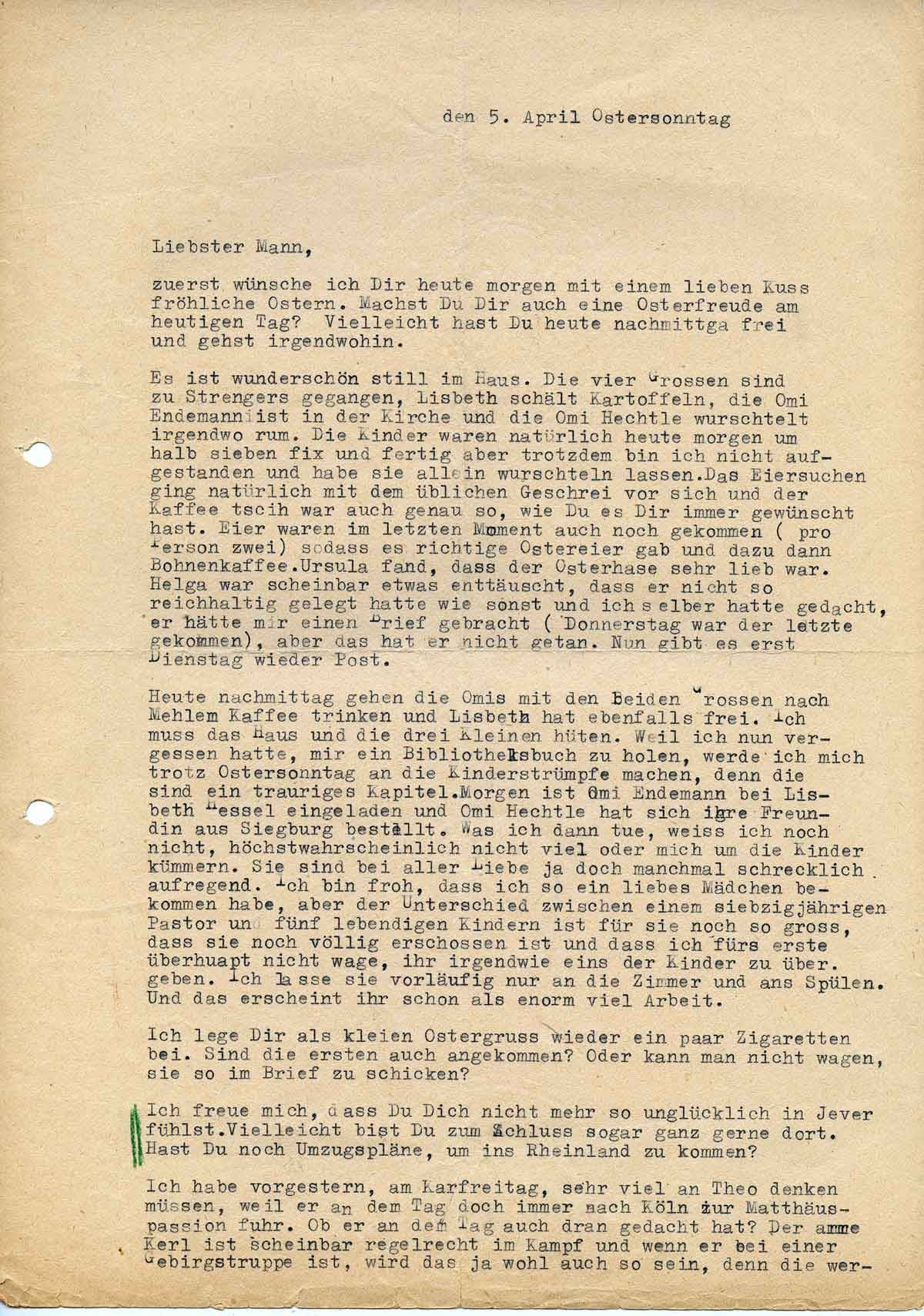Ich lege Dir als kleinen Ostergruß ein paar Zigaretten bei. Sind die ersten auch angekommen? Oder kann man nicht wagen, sie so im Brief zu schicken. Ich freue mich, dass Du Dich nicht mehr so unglücklich in Jever fühlst. Vielleicht bist Du zum Schluss ganz gerne dort. Hast Du noch Umzugspläne, um ins Rheinland zu kommen?