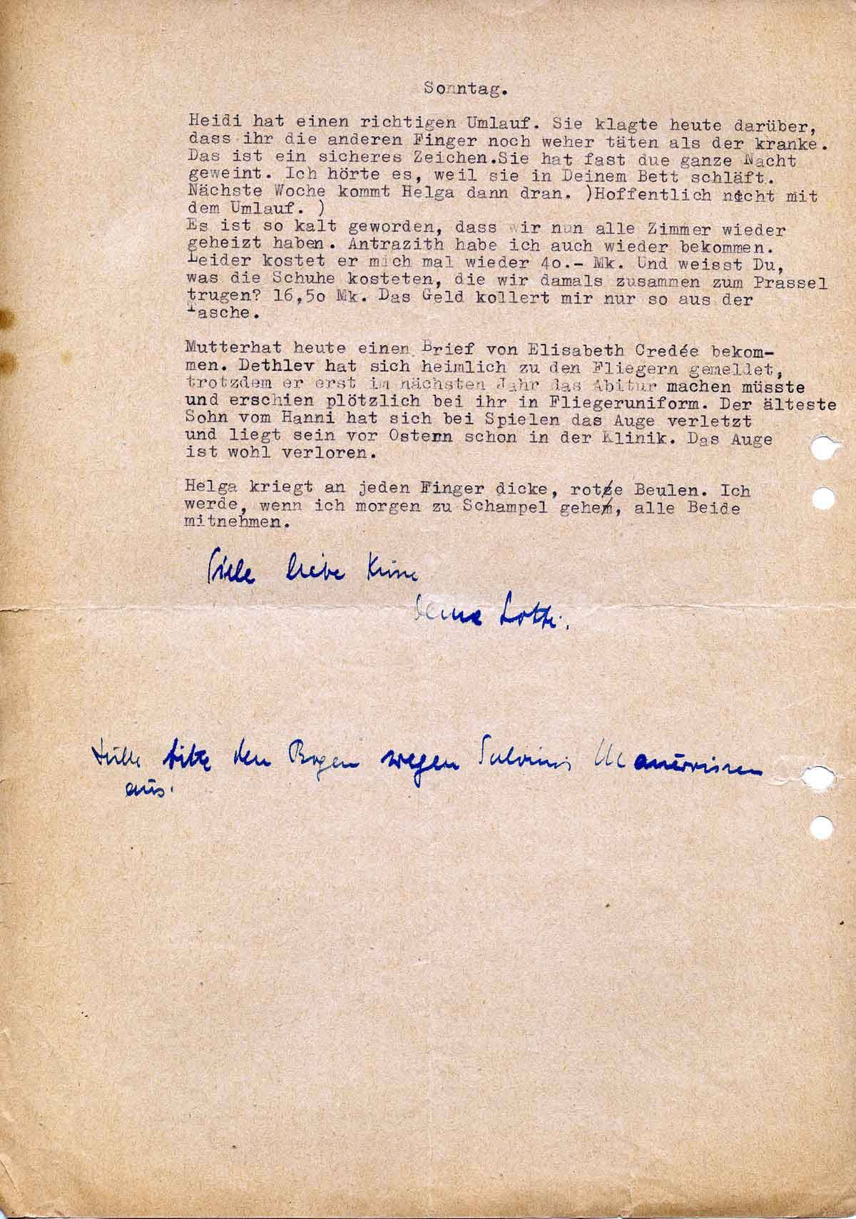 Mutter hat heute einen Brief von Elisabeth Credée (?) bekommen. Detlev Banthien hat sich heimlich zu den Fliegern gemeldet, trotzdem er erst im nächsten Jahr das Abitur machen müsste, und erschien bei ihr plötzlich in Fliegeruniform. Der älteste Sohn vom Hanni hat sich beim Spielen das Auge verletzt und liegt seit Ostern in der Klinik. Das Auge ist wohl verloren.