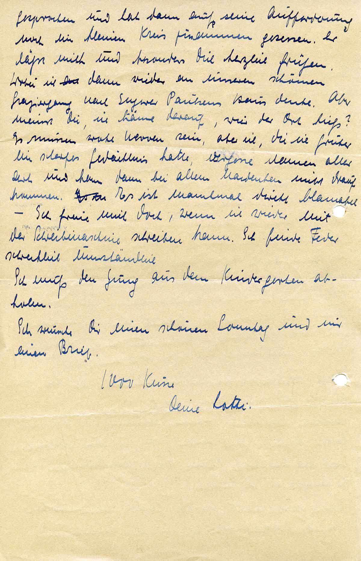 Ich freue mich doch, wenn ich wieder mit der Schreibmaschine arbeiten kann. Ich finde Feder schrecklich umständlich. Ich wünsche Dir einen schönen Sonntag und mir einen Brief. Deine Lotti
