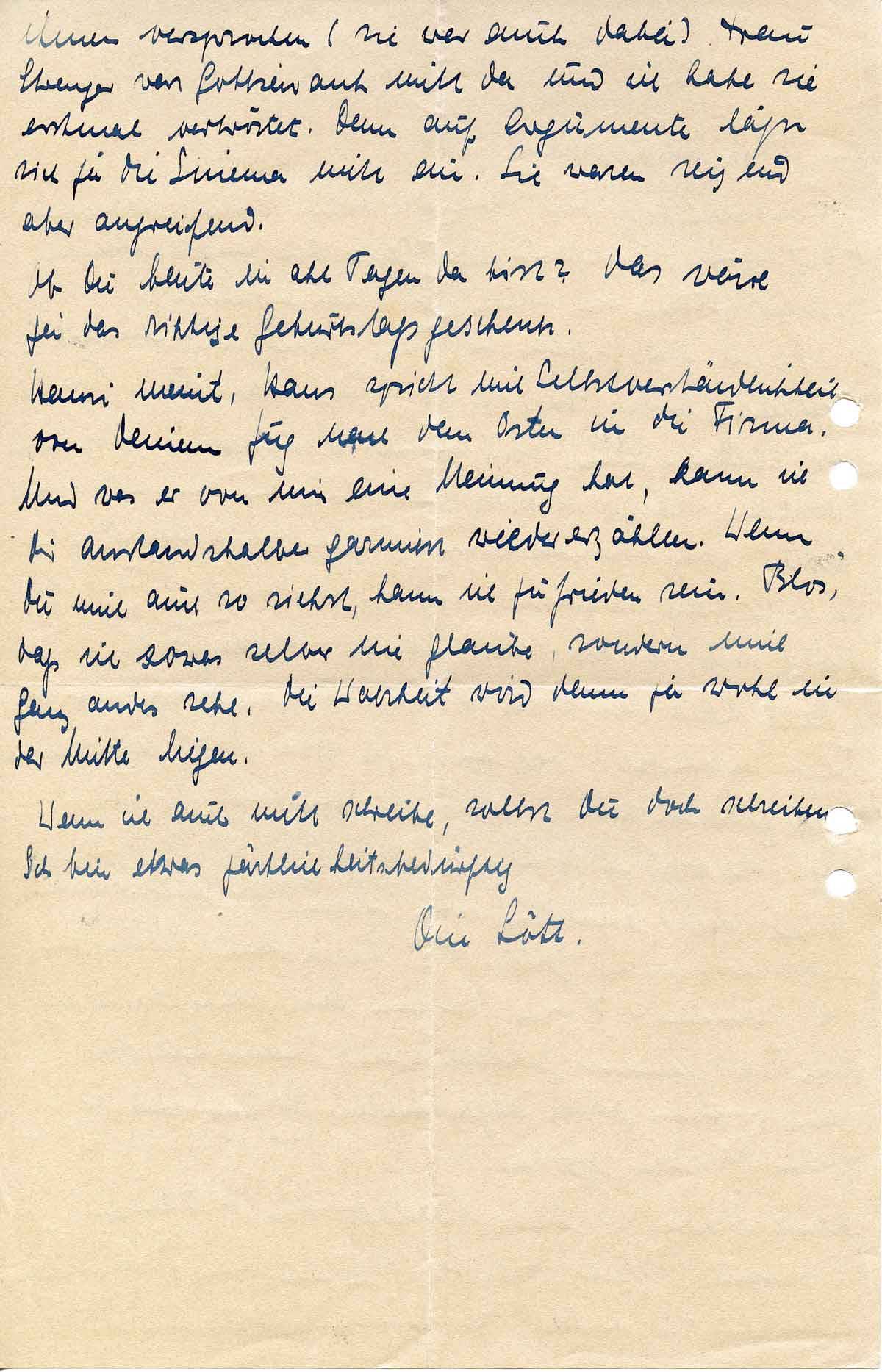 Hansi meint, Hans spricht mit Selbstverständlichkeit von Deinem Zug nach Osten in die. Firma. Und was er von mir für eine Meinung hat, kann ich Dir anstandshalber gar nicht swiedererzählen. Wenn Du mich auch so siehst, kann ich zufrieden sein. Bloß, dass ich sowas selber nie glaube, sondern mich ganz anders sehe. Die Wahrheit wird dann ja in der Mitte liegen. Wenn ich auch nicht schreibe, sollst Du es doch. Ich bin etwas zärtlichkeitsbedürftig. Din Lött