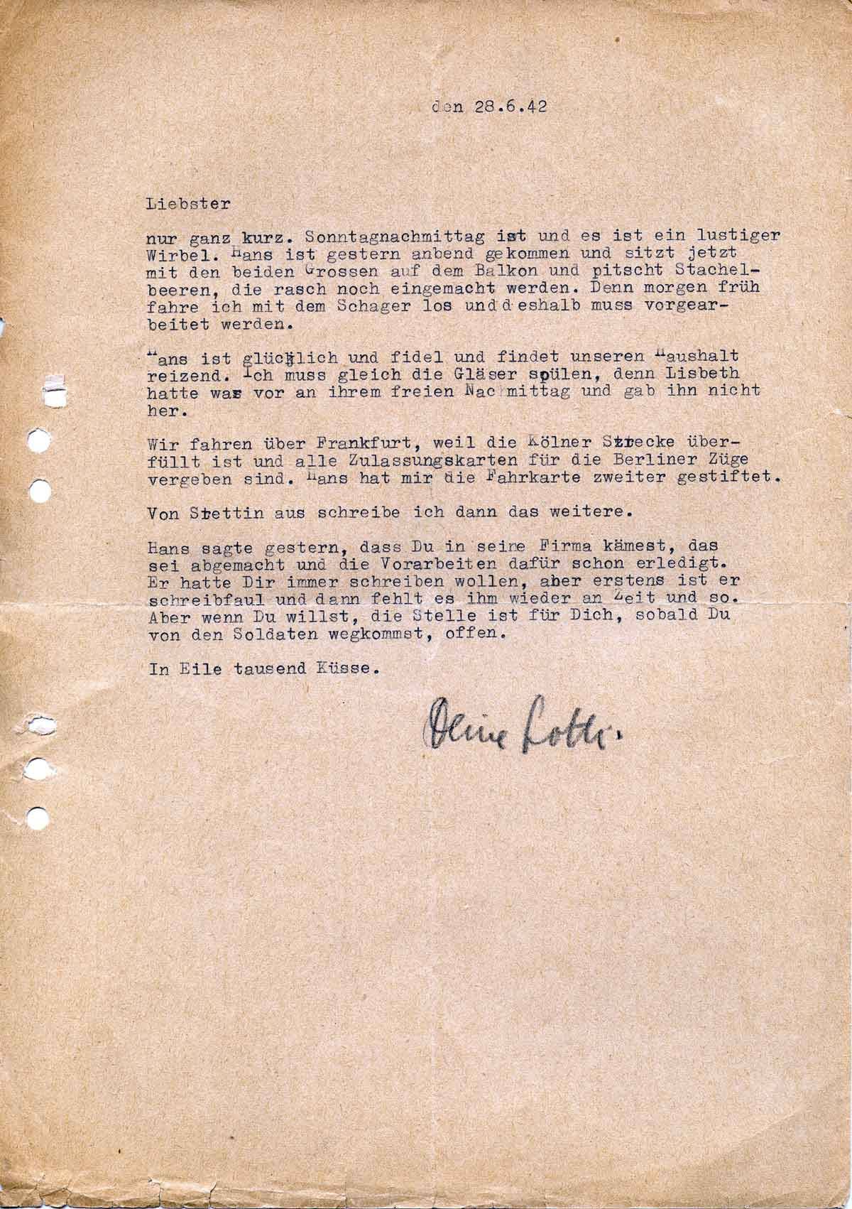 Charlotte Endemann an ihren Mann Harald, 28. Juni 1942