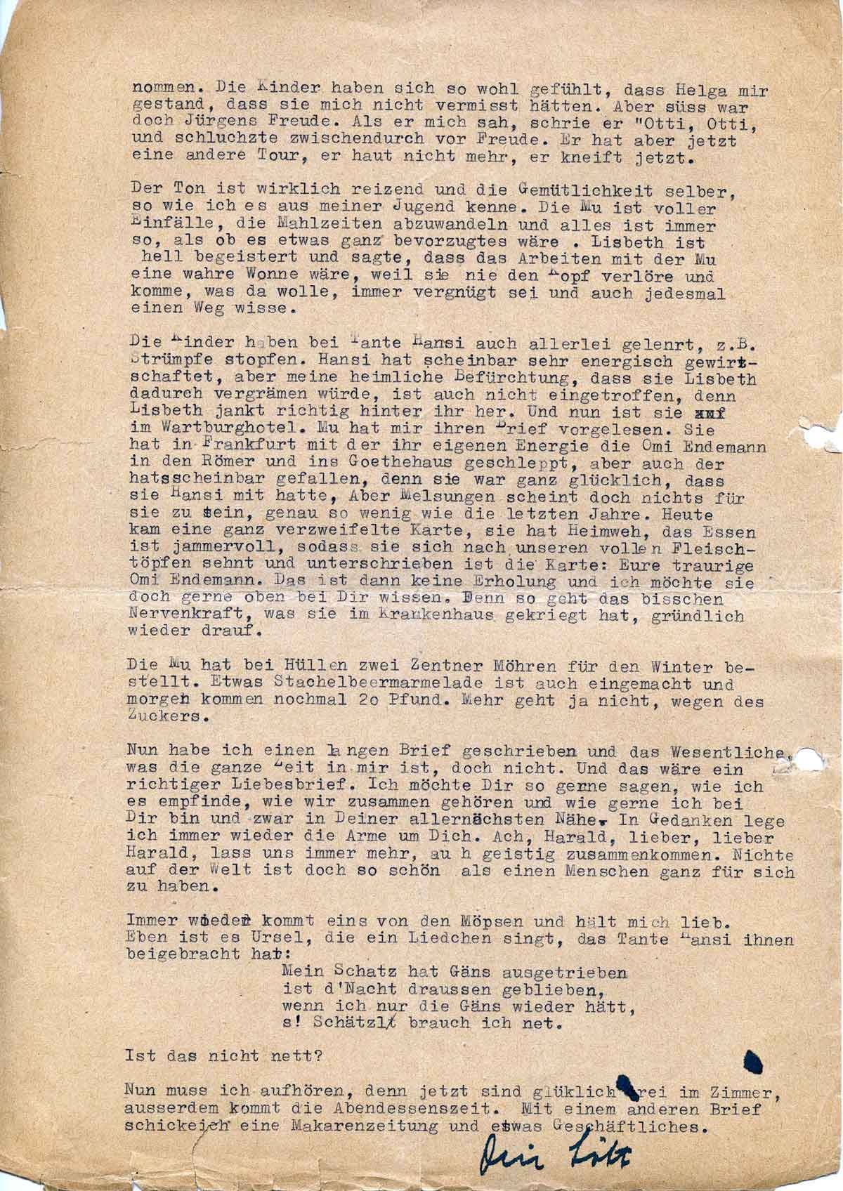 Nun habe ich einen langen Brief geschrieben und das Wesentlichste doch nicht. Und das wäre ein richtiger Liebesbrief. Ich möchte Dir so gerne sagen, wie ich es empfinde, wie wir zusammen gehören und wie gerne ich bei Dir bin und zwar in Deiner allernächsten Nähe. In Gedanken lege ich immer wieder die Arme um Dich. Ach Harald, lieber, lieber Harald, lass uns immer mehr, auch geistig zusammenkommen. Nichts auf der Welt ist doch so schön als einen Menschen ganz für sich zu haben.
