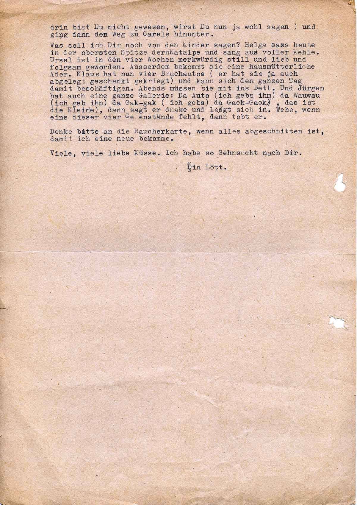 Was soll ich Dir noch von den Kindern sagen? Helga sass heute in der obersten Spitze der Katalpe und sang aus voller Kehle. Ursel ist in den vier Wochen merkwürdig still geworden und lieb und folgsam. Außerdem bekommt sie eine hausmütterliche Ader. Klaus hat nun vier Bruchautos. Er hat sie ja auch abgelegt geschenkt gekriegt und kann sich den ganzen Tag damit beschäftigen. Abends müssen sie mit ins Bett. Und Jürgen hat auch eine ganze Galerie: "Da Auto", (ich geb's ihm) "Da Wauwau" (ich geb's ihm), "da Gack-Gack" (ich geb's) "da Ga-Gack" (das ist die kleine Ente, ich geb's). Dann sagt er danke und legt sich hin. Wehe, wenn eins fehlt, dann tobt er.