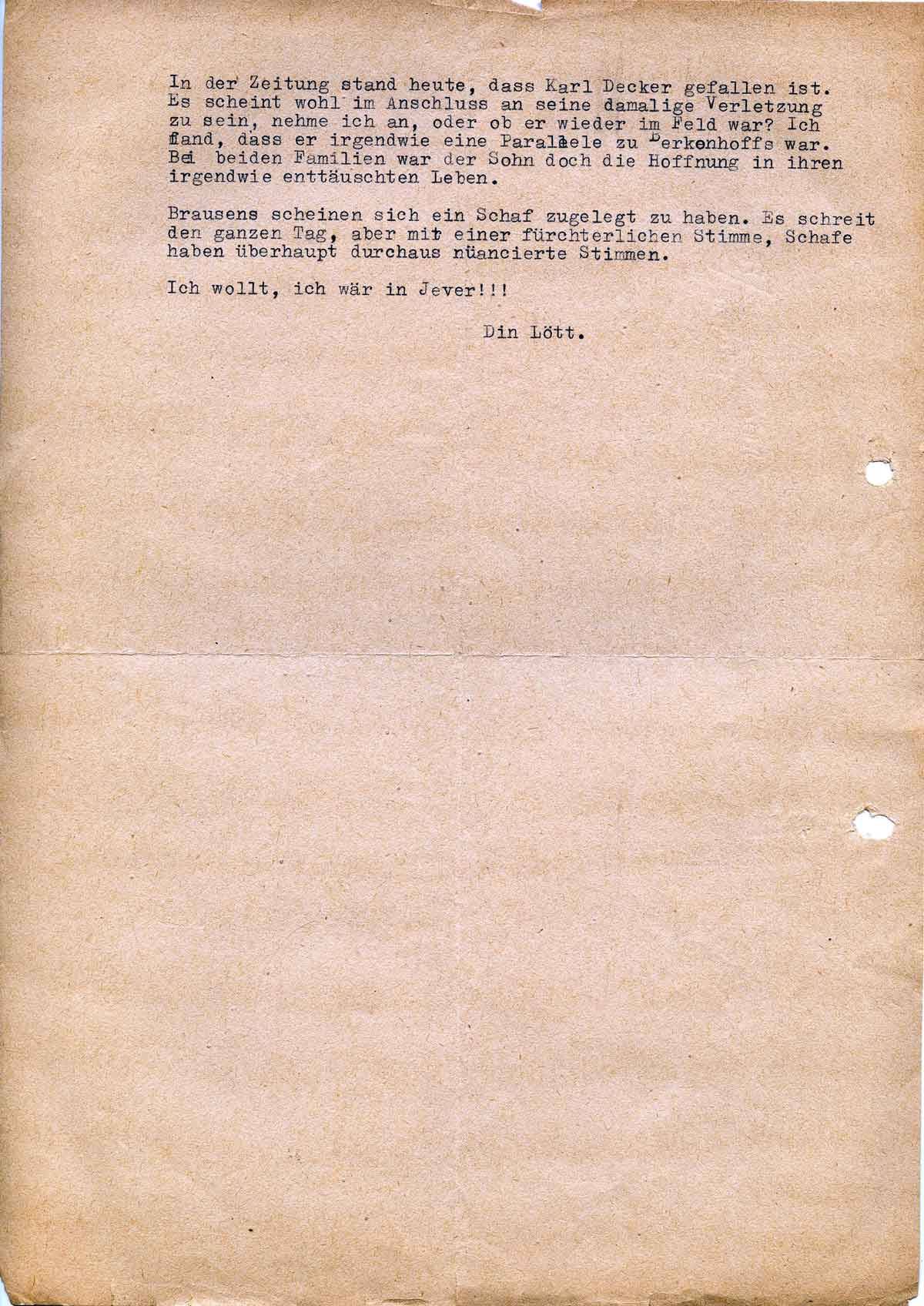 In der Zeitung stand heute, dass Karl Decker gefallen ist. Es scheint wohl im Anschluss an seine damalige Verletzung zu sein, nehme ich an, oder ob er wieder im Feld war? Ich fand, dass er irgendwie eine Parallele zu Berkenhoffs war. Bei beiden Familien war doch der Sohn die Hoffnung in ihrem irgendwie enttäuschten Leben.