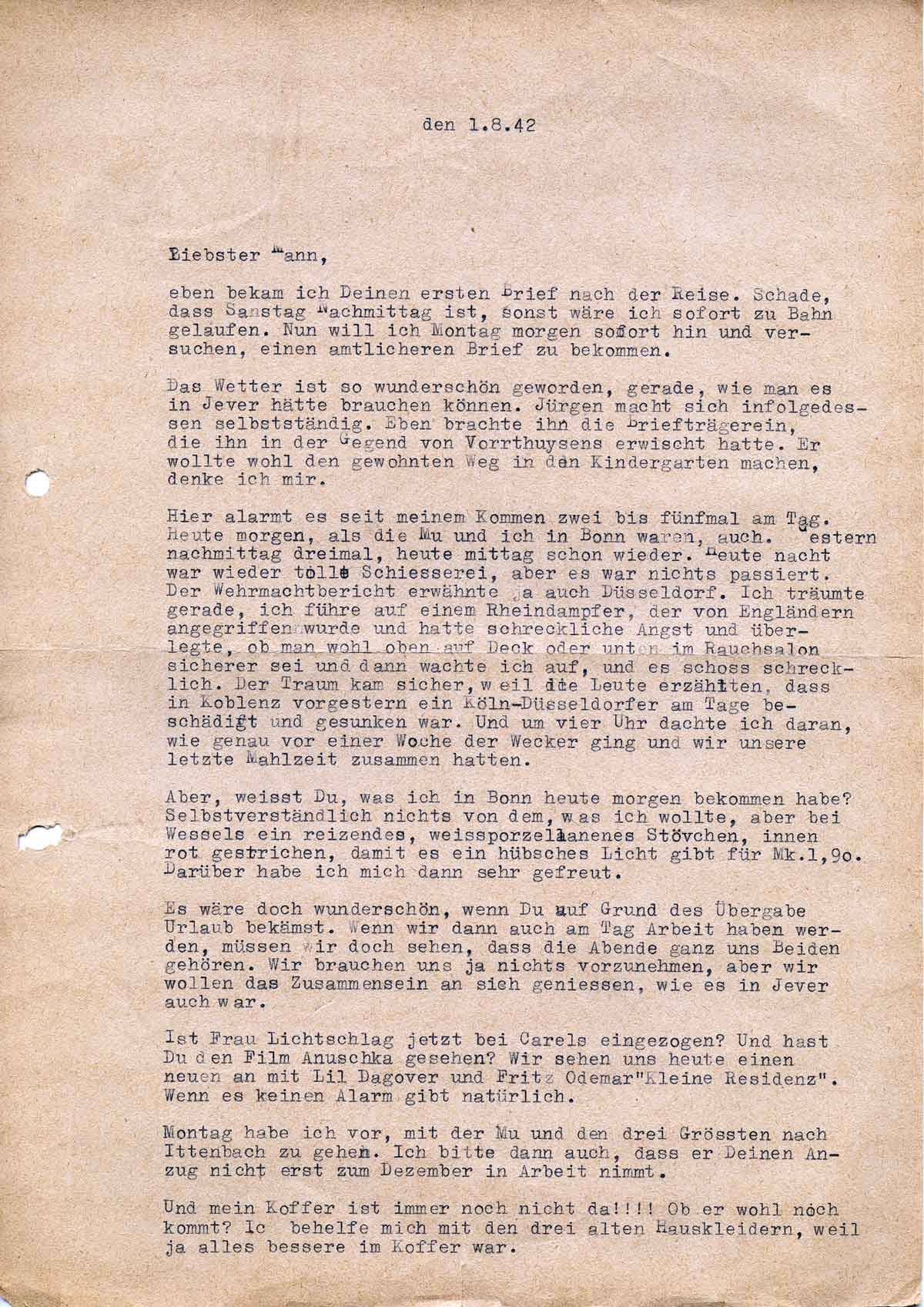 Charlotte Endemann an ihren Mann Harald, 1. August 1942