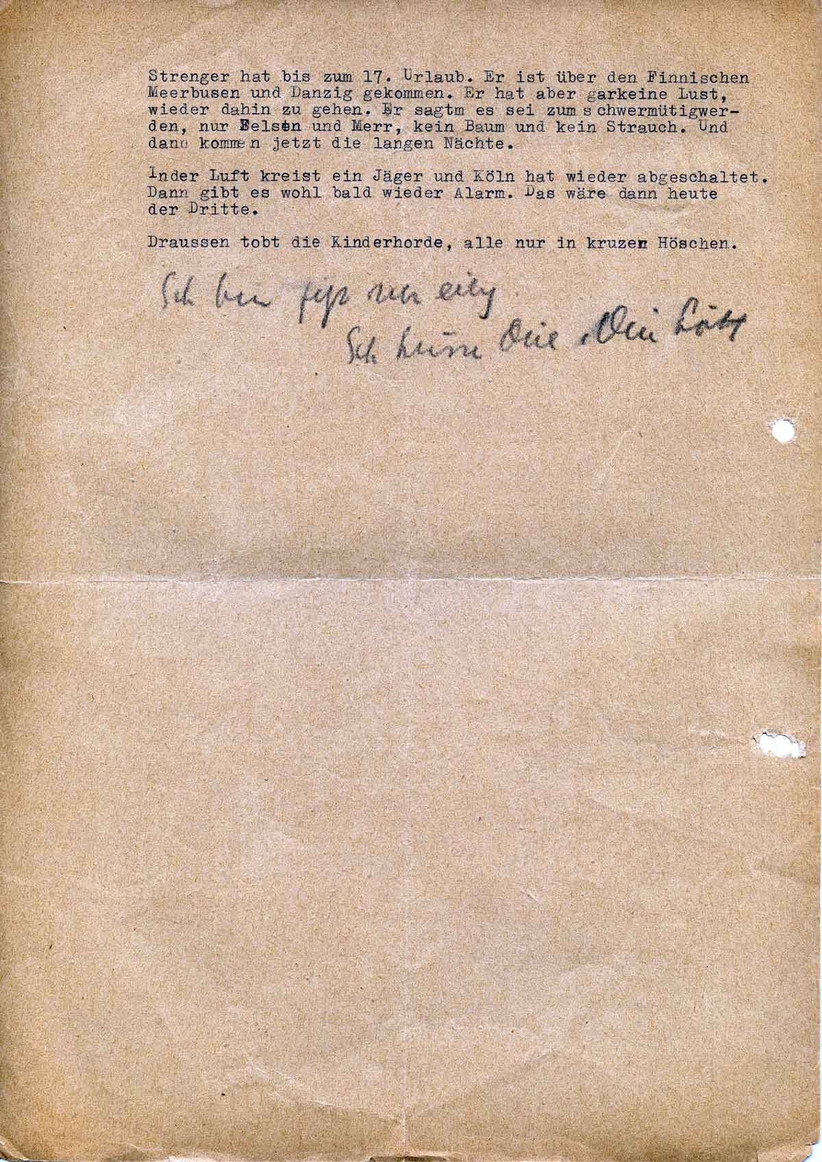 Hier alarmt es seit meinem Kommen zwei- bis fünfmal am Tag. Heute morgen, als die Mu und ich in Bonn waren, auch. Gestern nachmittag dreimal, heute mittag schon wieder. Heute nacht war wieder eine tolle Schießerei, aber es war nichts passiert. Der Wehrmachtbericht erwähnte ja auch Düsseldorf. Ich träumte gerade, ich führe auf einem Rheindampfer, der von Engländern angegriffen wurde, und hatte schreckliche Angst und überlegte, ob man wohl oben auf Deck oder unten im Rauchsalon sicherer sei, und dann wachte ich auf, und es schoss schrecklich. Der Traum kam sicher, weil die Leute erzählten, dass in Koblenz gestern ein Köln-Düsseldorfer am Tage beschädigt und gesunken war. Und um vier Uhr dachte ich daran, wie genau vor einer Woche der Wecker ging und wir unsere letzte Mahlzeit zusammen hatten.