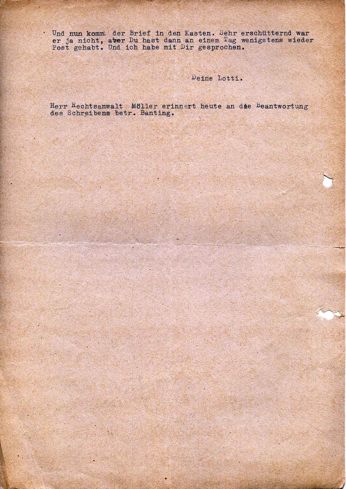 Übrigens ist Ilses Koffer auch nicht angekommen, und sie hatte ihre besten Sachen drin und die von Günther ebenfalls. Sie hatte ihn vor neun Wochen aufgegeben. - Es wäre doch scheußlich, wenn mein Koffer weg wäre. Immerhin hatte ich meine besten Sachen drin und vier Paar Schuhe, abgesehen von allem anderen. Wenn ich wirklich Geldersatz bekäme, könnte ich damit ja doch nichts anfangen. Vorläufig laufe ich in meinen alten Hauskleidern herum, auch wenn ich in die Stadt gehe. Aber schließlich, was soll ich mich groß aufregen, wenn er weg wäre.