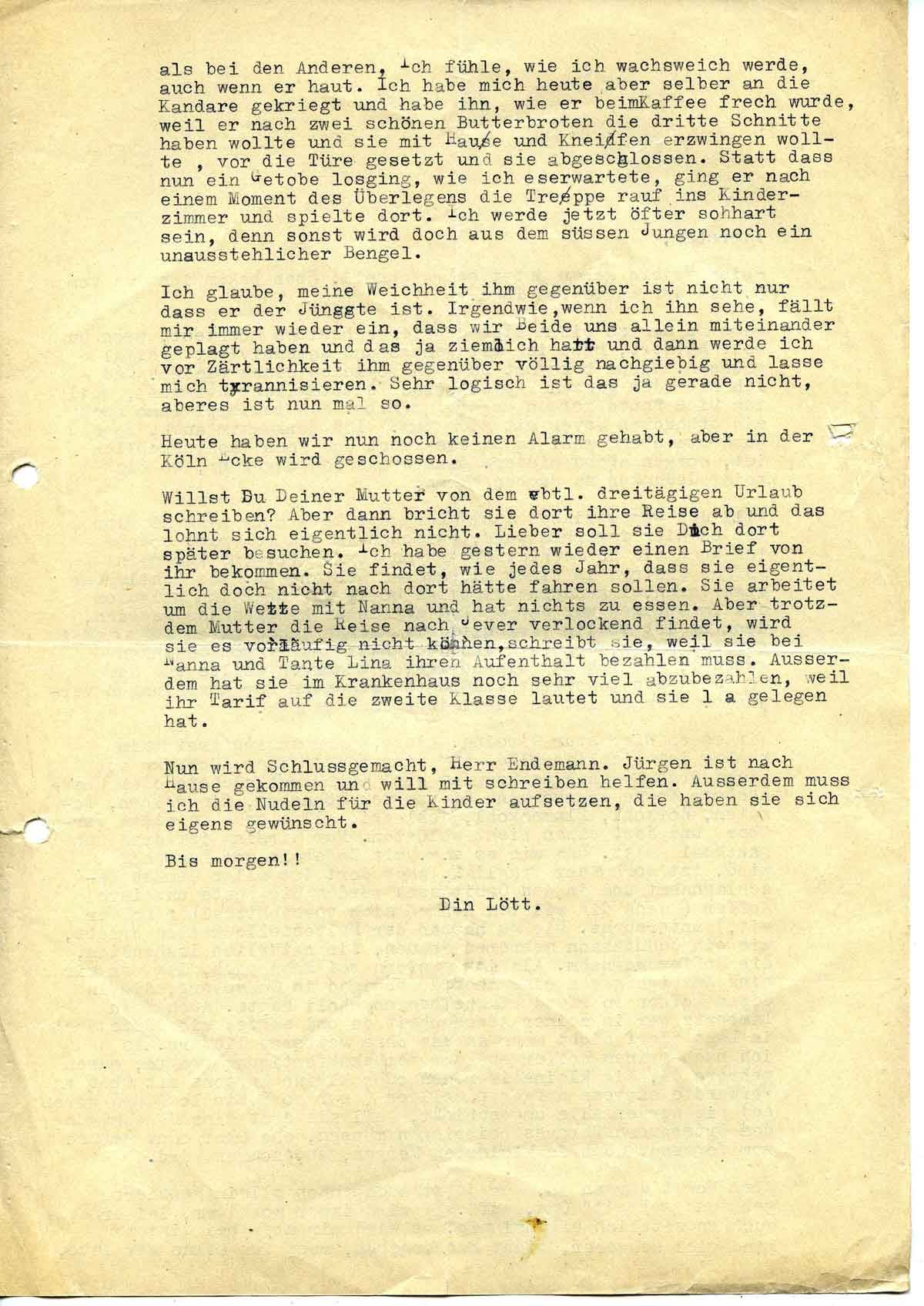 Nun wird Schluss gemacht, Herr Endemann. Jürgen ist nach Hause gekommen und will mit schreiben helfen. Ausserdem muss ich die Nudeln für die Kinder aufsetzen, die haben sie sich eigens gewünscht.
