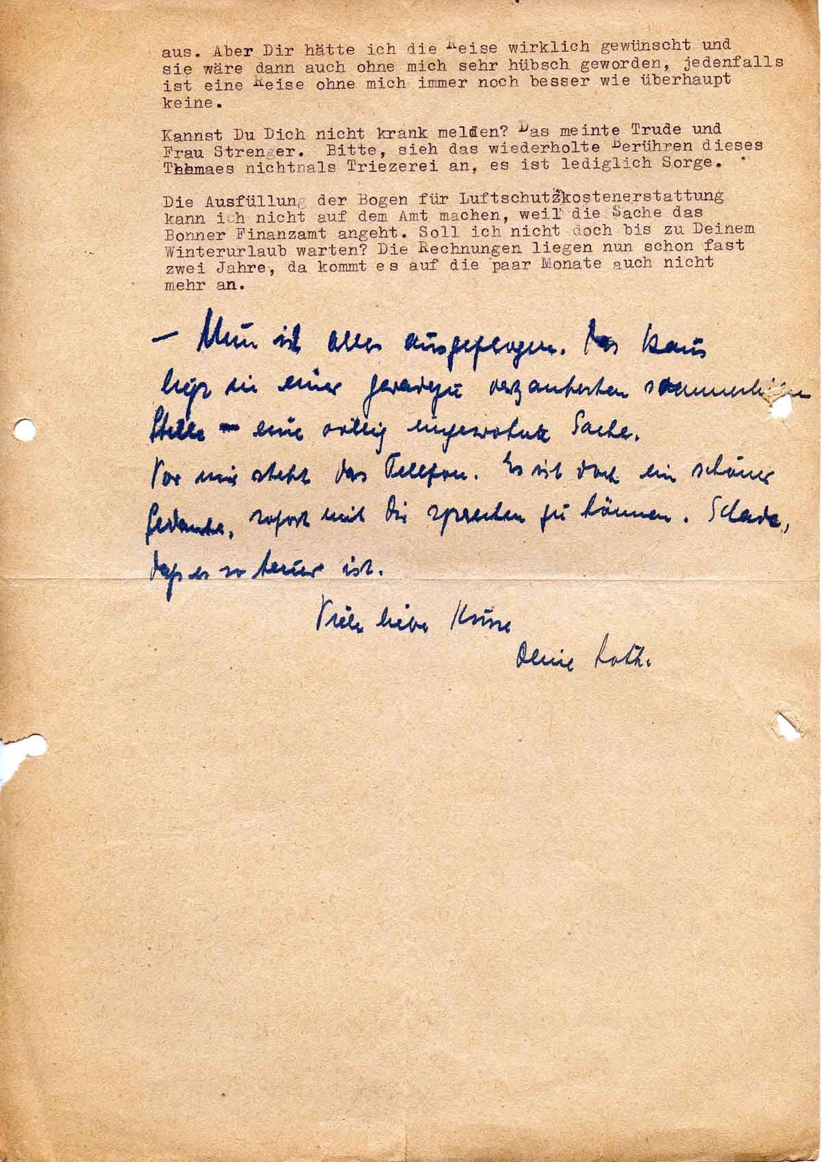 Sag mal, Harald, warum hast Du nicht wenigstens ein paar Worte geschrieben, wenn es Dir auch nicht gut ging? Und wenn Du Dir nur vom Herzen geschrieben hättest, wie Dir zumute ist. Denn dazu sind wir doch Mann und Frau, dass Du mir auch schreibst, wenn es Dir körperlich oder seelisch nicht gut geht. Denn wir sind doch dazu da, alles miteinander zu teilen und ich kann Dir dann doch, wenigstens im Brief, vielleicht etwas helfen. Und schiebe bitte die Untersuchung nicht auf die lange Bank und schreibe mir so schnell wie möglich das Ergebnis. Oder ist die Unstimmigkeit seelisch bedingt? Dann schreibe es mir und ich versuche Dir zu helfen und zu raten, so gut ich kann.