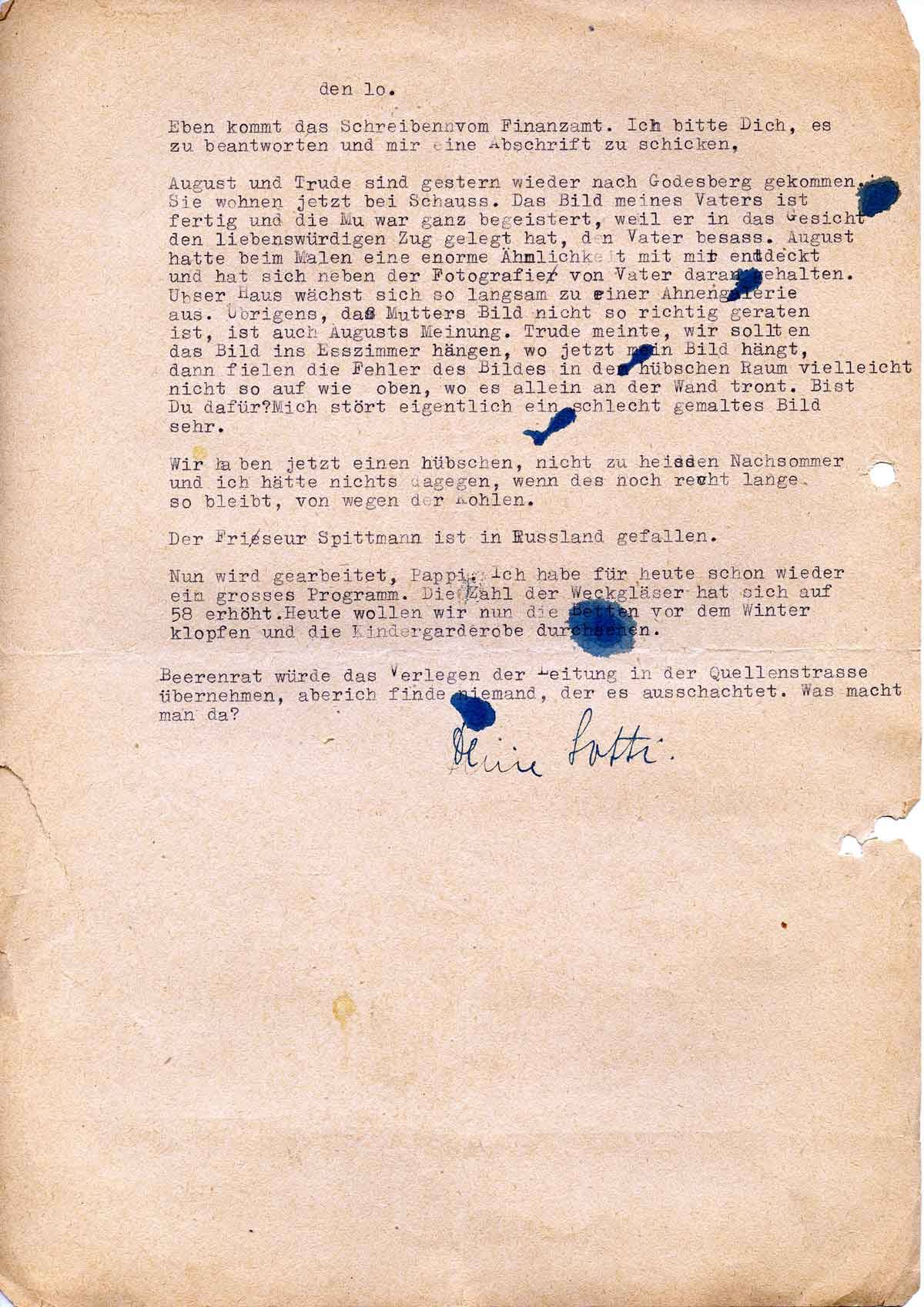 Übrigens, dass Mutters Bild nicht so richtig geraten ist, ist auch Augustes Meinung. Trude meinte, wir sollten das Bild ins Esszimmer hängen, wo jetzt auch mein Bild hängt, dann fielen die Fehler des Bildes in dem hübschen Raum vielleicht nicht so auf wie oben, wo es allein an der Wand tront. Bist Du dafür? Mich stört eigentlich ein schlecht gemaltes Bild sehr.