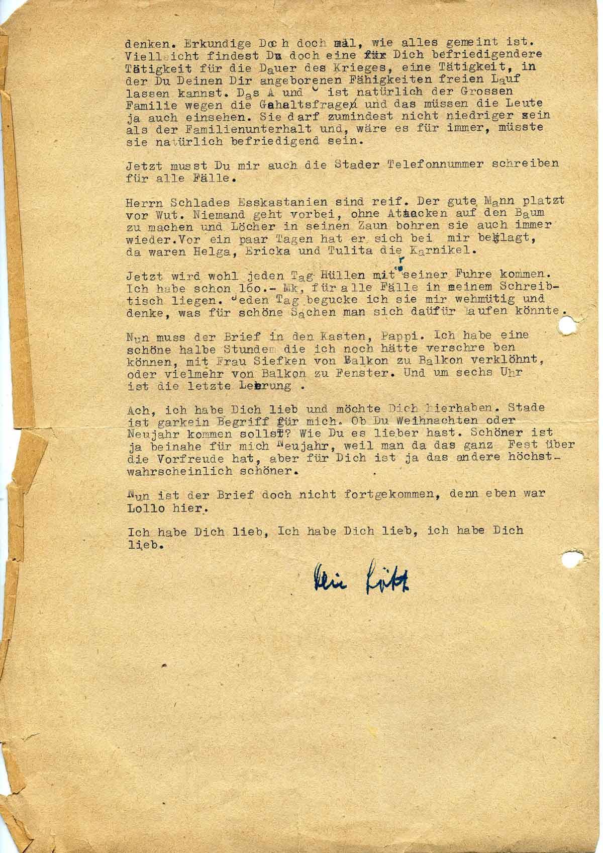 Jetzt wird wohl jeden Tag Hüllen mit seiner Fuhre kommen. Ich habe schon 160,- Mk. für alle Fälle in meinem Schreibtisch liegen. Jeden Tag begucke ich sie mir wehmütig und denke, was für schöne Sachen man dafür kaufen könnte: