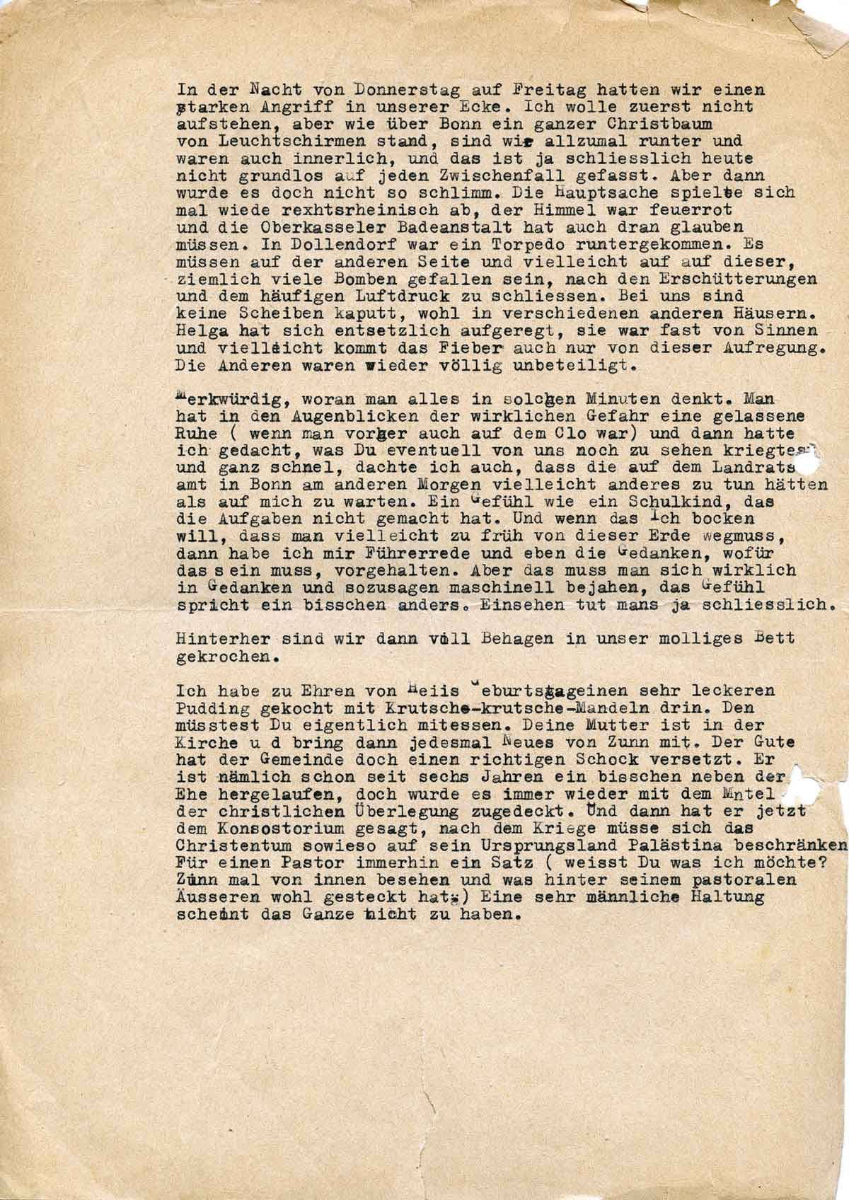 In der Nacht von Donnerstag auf Freitag hatten wir einen starken Angriff in unserer Ecke. Ich wollte zuerst nicht aufstehen, aber wie über Bonn ein ganzer Christbaum stand sind wir allzumal runter und waren auf jeden Zwischenfall gefasst. Aber dann wurde es doch nicht so. Die Hauptsache spielte sich rechtsrheinisch ab, der Himmel war feuerrot, und die Oberkasseler Badeanstalt hat auch dran glauben müssen. In Dollendorf war ein Torpedo runtergekommen. Es müssen auf der anderen Seite und vielleicht auch auf dieser ziemlich viele Bomben gefallen sein, nach den Erschütterungen und dem häufigen Luftdruck zu schließen. Bei uns sind keine Scheiben kaputt, wohl in verschiedenen anderen Häusern. Helga hat sich entsetzlich aufgeregt, sie war fast von Sinnen, und vielleicht kommt das Fieber auch nur von dieser Aufregung. Die anderen waren wieder völlig unbeteiligt.