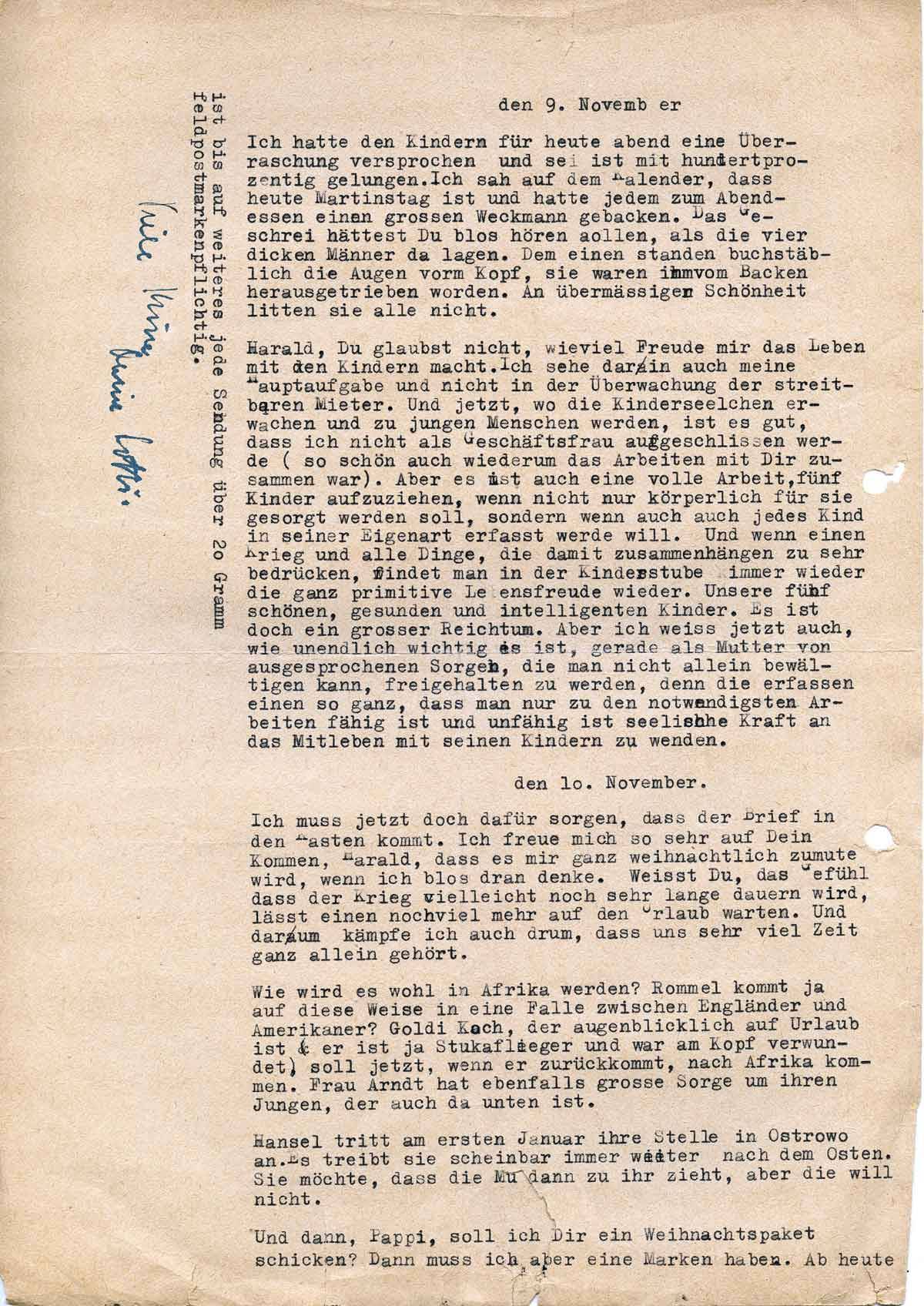 Ich muss jetzt dafür sorgen, dass der Brief in den Kasten kommt. Ich freue mich so sehr auf Dein Kommen, Harald, dass es mir ganz weihnachtlich zumut wird, wenn ich bloß daran denke. Weißt Du, das Gefühl, dass der Krieg vielleicht noch sehr lange dauern wird, lässt einen noch viel mehr auf den Urlaub warten. Und darum kämpfe ich auch darum, dass uns sehr viel Zeit ganz allein gehört.