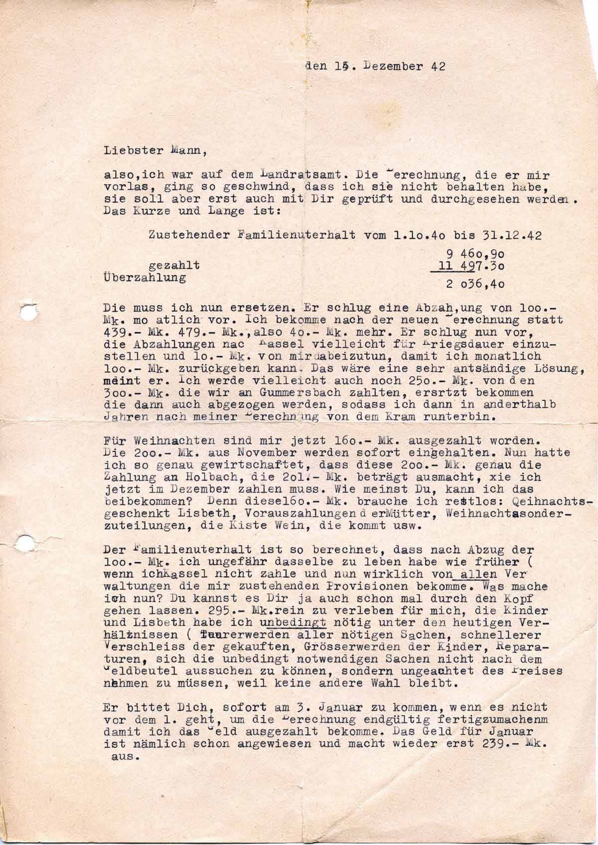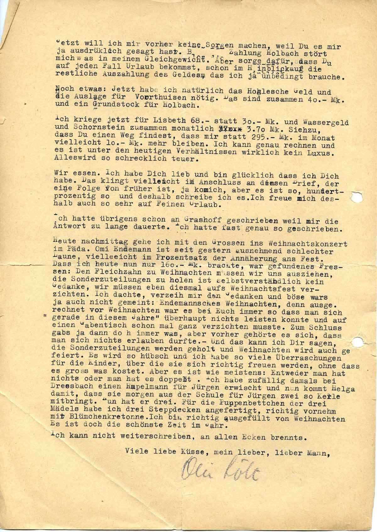 Für Weihnachten sind mir jetzt 160.- Mk. ausgezahlt worden. Die 200.- Mk. aus November werden sofort eingehalten. Nun hatte ich so genau gewirtschaftet, dass diese 200.- Mk. genau die Zahlung an Holbach, die 201.- Mk. beträgt ausmacht, die ich im Dezember zahlen muss. Wie meinst Du, kann ich das beibekommen? Denn diese 160.- Mk. brauche ich restlos: Weihnachtsgeschenk Lisbeth, Vorauszahlungen der Mütter, Weihnachts-Sonderzuteilungen usw.