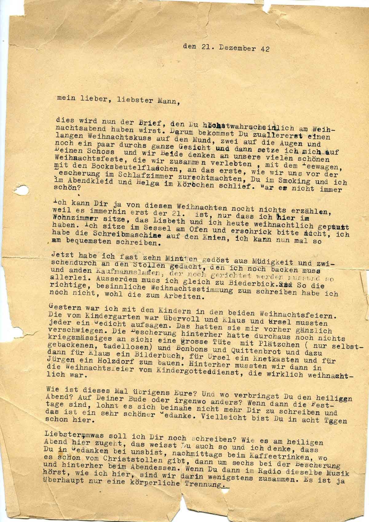 Das wird nun der Brief, den Du höchstwahrscheinlich am Weihnachtsabend haben wirst. Darum bekommst Du zuallererst einen langen Weihnachtskuss auf den Mund, zwei auf die Augen und noch ein paar durchs ganze Gesicht, und dann setze ich mich auf Deinen Schoß, und wir beide denken an unsere vielen schönen Weihnachtsfeste, die wir zusammen verlebten, mit dem Teewagen mit den Bocksbeutelflaschen, an das erste, wie wir uns vor der Bescherung zurechtmachten, Du im Smoking und ich im Abendkleid, und Helga im Körbchen schlief. War es nicht immer schön?