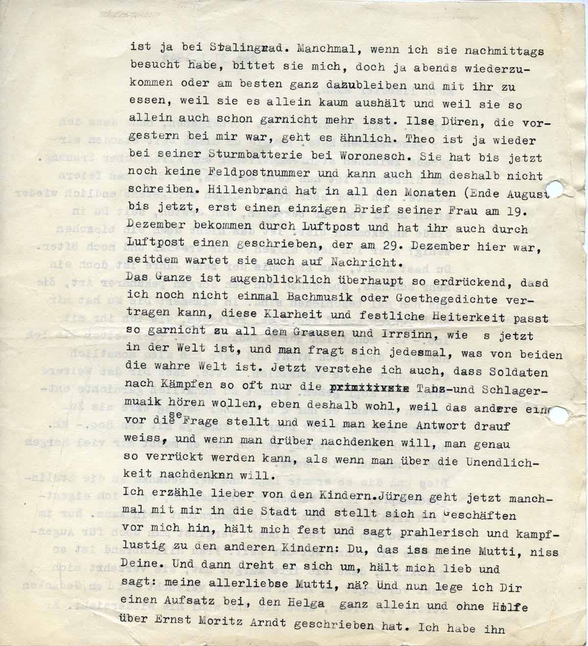 Ilse Düren, die vorgestern bei mir war, geht es ähnlich. Theo ist ja wieder bei seiner Sturmbatterie bei Woronesch. Sie hat bis jetzt keine Feldpostnummer und kann ihm deshalb nicht schreiben. Hillenbrand hat in all den Monaten (Ende August bis jetzt) erst einen einzigen Brief seiner Frau bekommen durch Luftpost. Sie hat auch erst einen Brief bekommen und wartet seitdem auf Nachricht.