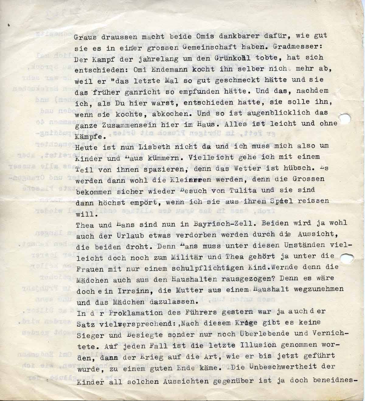 In der Proklamation des Führers gestern war ja auch der Satz vielversprechend: 'Nach diesem Kriege gibt es keine Sieger und Besiegte, sondern nur noch Überlebende und Vernichtete.' Auf jeden Fall ist die letzte Illusion genommen worden, dass der Krieg auf die Art, wie er bis jetzt geführt wurde, zu einem guten Ende k äme. Die Unbeschwertheit der Kinder all solchen Aussichten gegenüber ist ja doch beneidens-