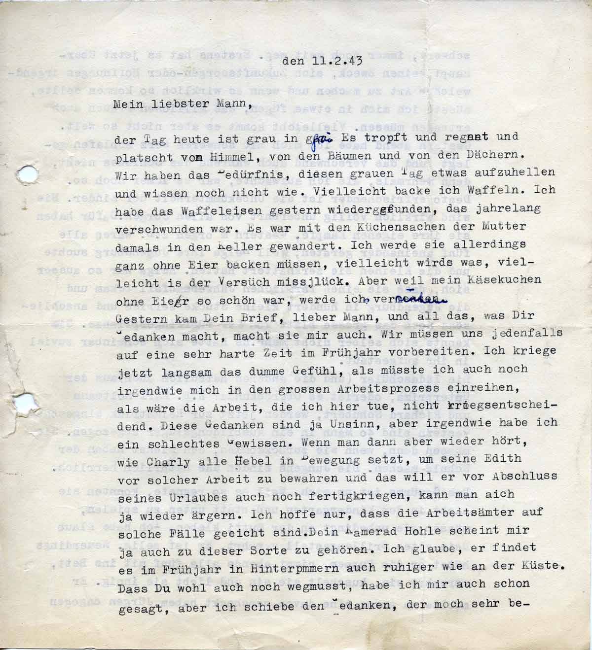 Charlotte Endemann an ihren Mann Harald, 11. Februar 1943