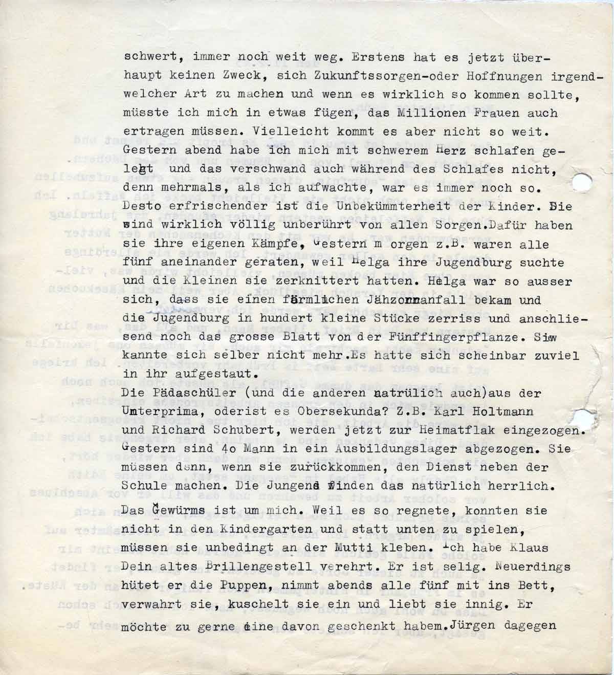 Die Pädaschüler (und die anderen natürlich auch) aus der Unterprima (oder ist es Oberse-kunda?) z.B. Karl Holtmann und Richard Schubert, werden jetzt zur Heimatflak eingezogen. Gestern sind 40 Jungen in ein Ausbildungslager abgezogen. Sie müssen dann, wenn sie wiederkommen, den Dienst neben der Schule machen. Die Jungen finden das natürlich herrlich.