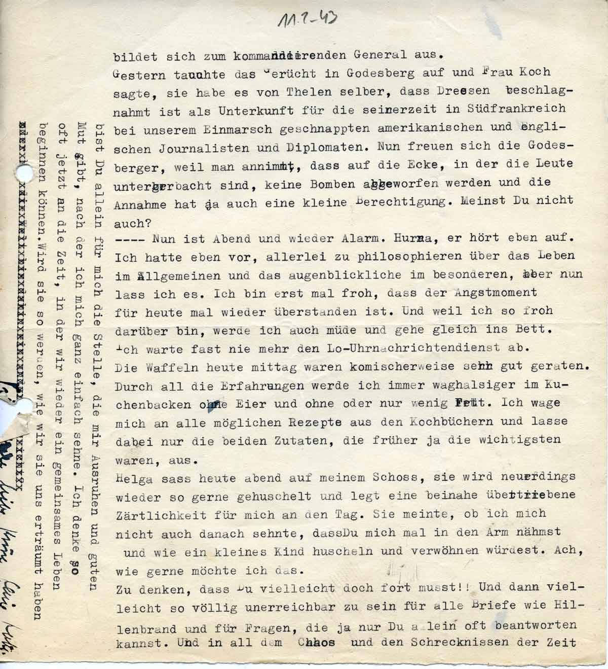 Gestern tauchte das Gerücht in Godesberg auf, und Frau Koch sagte, sie habe es vom Ortsgruppenleiter Thelen selber, dass Dreesen beschlagnahmt ist als Unterkunft für die seinerzeit bei unserem Einmarsch geschnappten amerikanischen und englischen Journalisten und Diplomaten. Nun freuen sich die Godesberger, weil man annimmt, dass auf die Ecke, in der die Leute untergebracht sind, keine Bomben abgeworfen werden. Und diese Annahme hat ja auch eine kleine Berechtigung. Meinst Du nicht auch?
