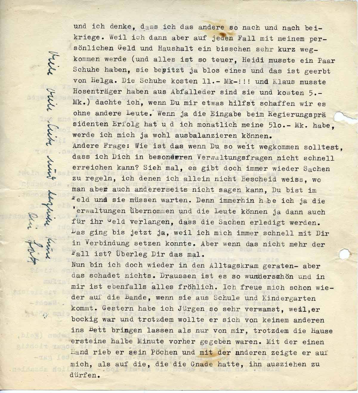 und ich denke, dass ich das andere nach und nach beikriege. Weil ich dann aber auf jeden Fall mit meinem persönlichen Geld und dem Haushalt ein bisschen sehr kurz wegkommen werde (und alles ist so teuer) - Heidi müsste ein Paar Schuhe haben, sie besitzt bloß eins, und das ist geerbt; die Schuhe kosten 11,- Mk.!!!, und Klaus musste Hosenträger haben, aus Abfall-Leder sind sie und kosten 5,- Mk.) dachte ich, wenn du mir etwas hilfst, schaffen wir es ohne andere Leute. Wenn ja die Eingabe beim Regierungspräsidenten Erfolg hat und ich monatlich meine 510.- Mk. habe, werde ich mich wohl ausbalancieren können.