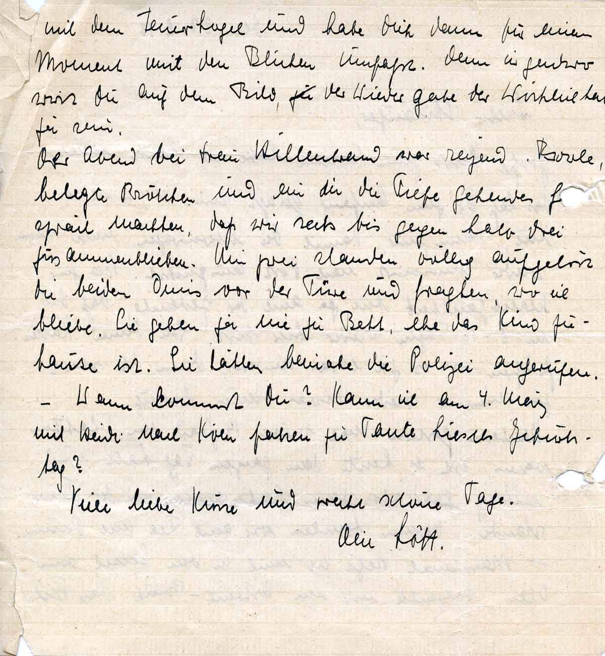 Der Abend bei Frau Hillenbrand war reizend. Bowle, belegte Brötchen und ein in die Tiefe gehendes Gespräch machten, dass wir sechs bis gegen halb drei zusammenblieben. Um zwei standen völlig aufgelöst die beiden Omis vor der Türe und fragten, wo ich bleibe. Sie gehen ja nie zu Bett, ehe das Kind zuhause ist. Sie hätten beinahe die Polizei gerufen. – Wann kommst Du? Kann ich am 4. März mit Heidi nach Köln fahren zu Tante Liesels Geburtstag?