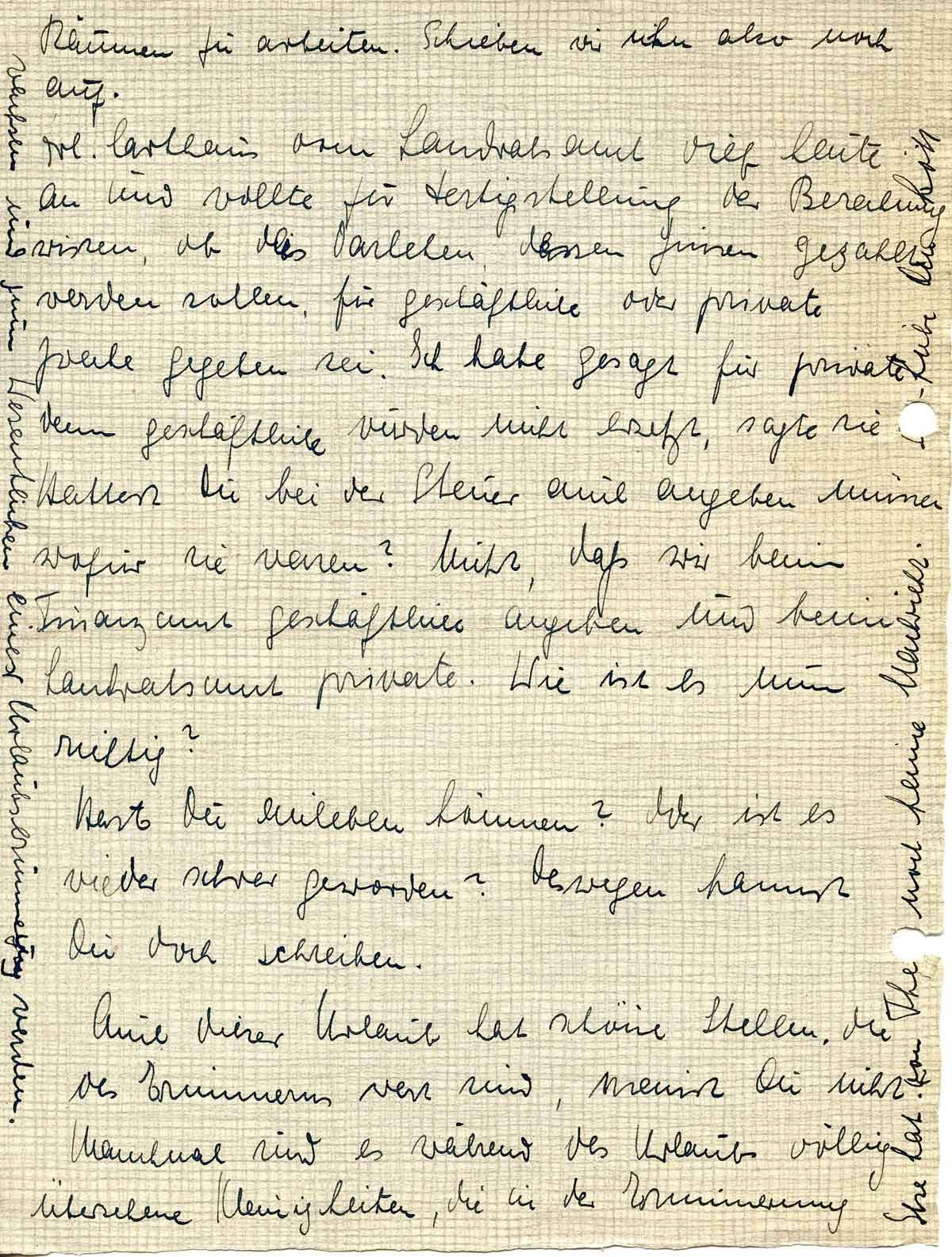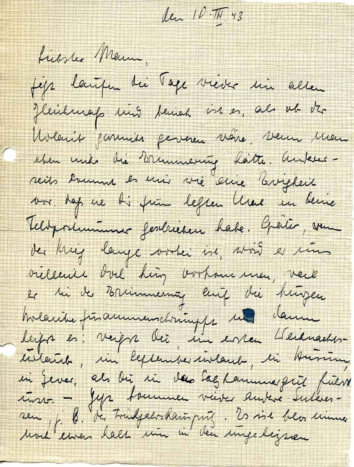 Jetzt laufen die Tage wieder im alten Gleichmaß, und es ist beinahe, als ob der Urlaub gar nicht gewesen wäre. Wenn man eben nicht die Erinnerung hätte. Anderseits kommt es mir wie eine Ewigkeit vor, dass ich Dir zum letzten Mal an Deine Feldpostnummer geschrieben habe. Später, wenn der Krieg lange vorbei ist, wird er uns vielleicht doch kurz vorkommen, weil er in der Erinnerung auf die kurzen Urlaube zusammenschrumpft, und dann heißt es; Weißt Du noch, im ersten Weihnachtsurlaub, in Husum, in Jever, als Du in das Salzkammergut fuhrst usw. – Jetzt kommen wieder andere Interessen, z.B. der Frühjahrputz. Es ist blos immer noch etwas kalt um in den ungeheizten