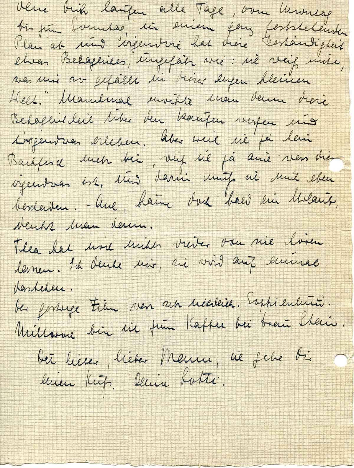 Ohne Dich laufen die Tage; VOM Montag bis zum Sonntag, in einem ganz feststehenden Plan ab, und irgendwie hat diese Beständigkeit etwas Behagliches, ungefähr wie: 'Ich weiß nicht, was mir so gefällt in dieser engen kleinen Welt.' Manchmal möchte man dann diese Behaglichkeit über den Haufen werfen und irgendwas erleben. Aber weil ich ja kein Backfisch mehr bin, weiß ich ja auch, was dieses Irgendwas ist, und darin muss ich mich eben bescheiden. - Ach, käme doch bald ein Urlaub, denkt man dann.