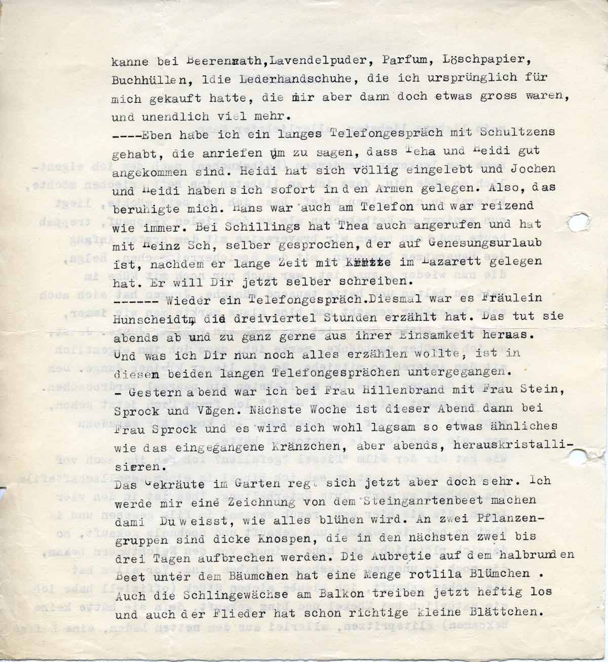 Eben habe ich ein langes Telefongespräch mit Schultzens gehabt, die anriefen, um zu sagen, dass Thea und Heidi gut angekommen sind. Heidi hat sich sofort eingelebt, und Jochen und Heidi haben sich sofort in den Armen gelegen. Also, das beruhigte mich. Hans war auch am Telefon und war reizend wie immer. Bei Schillings hat Thea auch angerufen und hat mit Heinz Schilling selber gesprochen, der auf Genesungsurlaub ist, nachdem er lange Zeit im Lazarett gelegen hatte. Er will Dir jetzt selber schreiben.