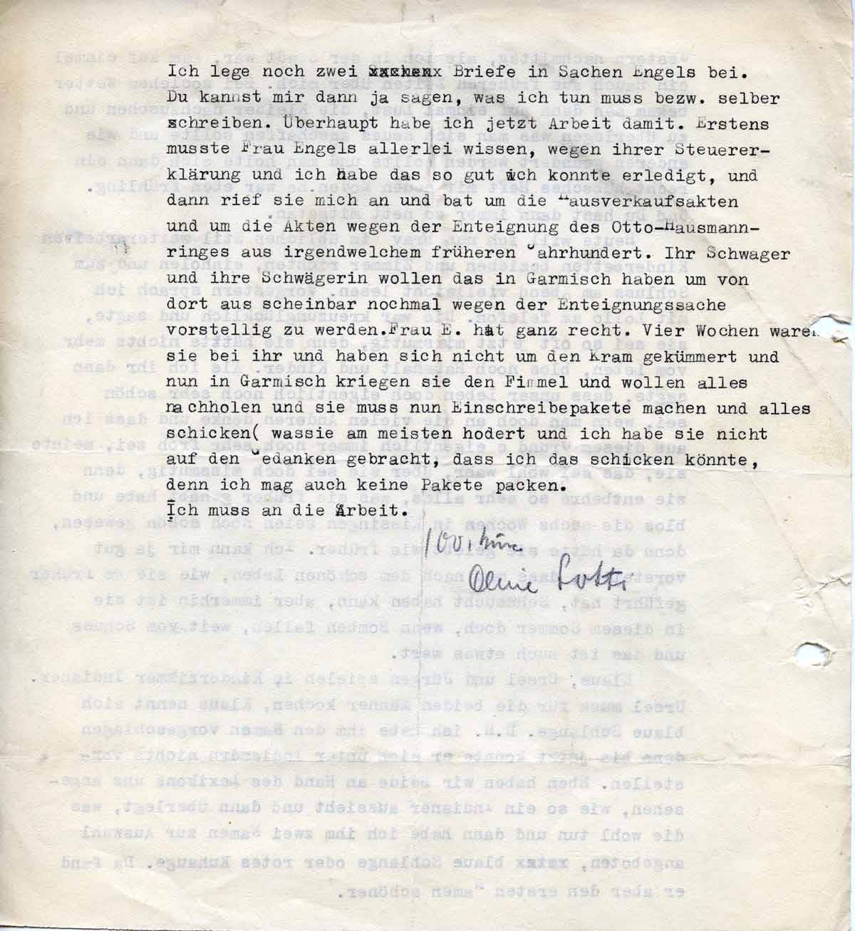 Ich lege noch zwei Briefe in Sachen Engels bei. Du kannst mir dann ja sagen, was ich tun muss bezw. selber schreiben. Überhaupt habe ich jetzt Arbeit damit. Erstens musste Frau Engels allerlei wissen, wegen ihrer Steuererklärung und ich habe das so gut ich konnte erledigt, und dann rief sie mich an und bat um die Hausverkaufsakten und um die Akten wegen der Enteignung des Otto-Hausmannringes aus irgendwelchem früheren Jahrhundert. Ihr Schwager und ihre Schwägerin wollen das in Garmisch haben um von dort aus scheinbar noch mal wegen der Enteignungssache vorstellig zu werden. Frau E. hat ganz recht. Vier Wochen waren sie bei ihr und haben sich nicht um den Kram gekümmert und nun in Garmisch kriegen sie den Fimmel und wollen alles nachholen und sie muss nun Einschreibepakete machen und alles schicken (was sie am meisten hodert und ich habe sie nicht auf den Gedanken gebrach, dass ich das schicken könnte, denn ich mag auch keine Pakete packen.