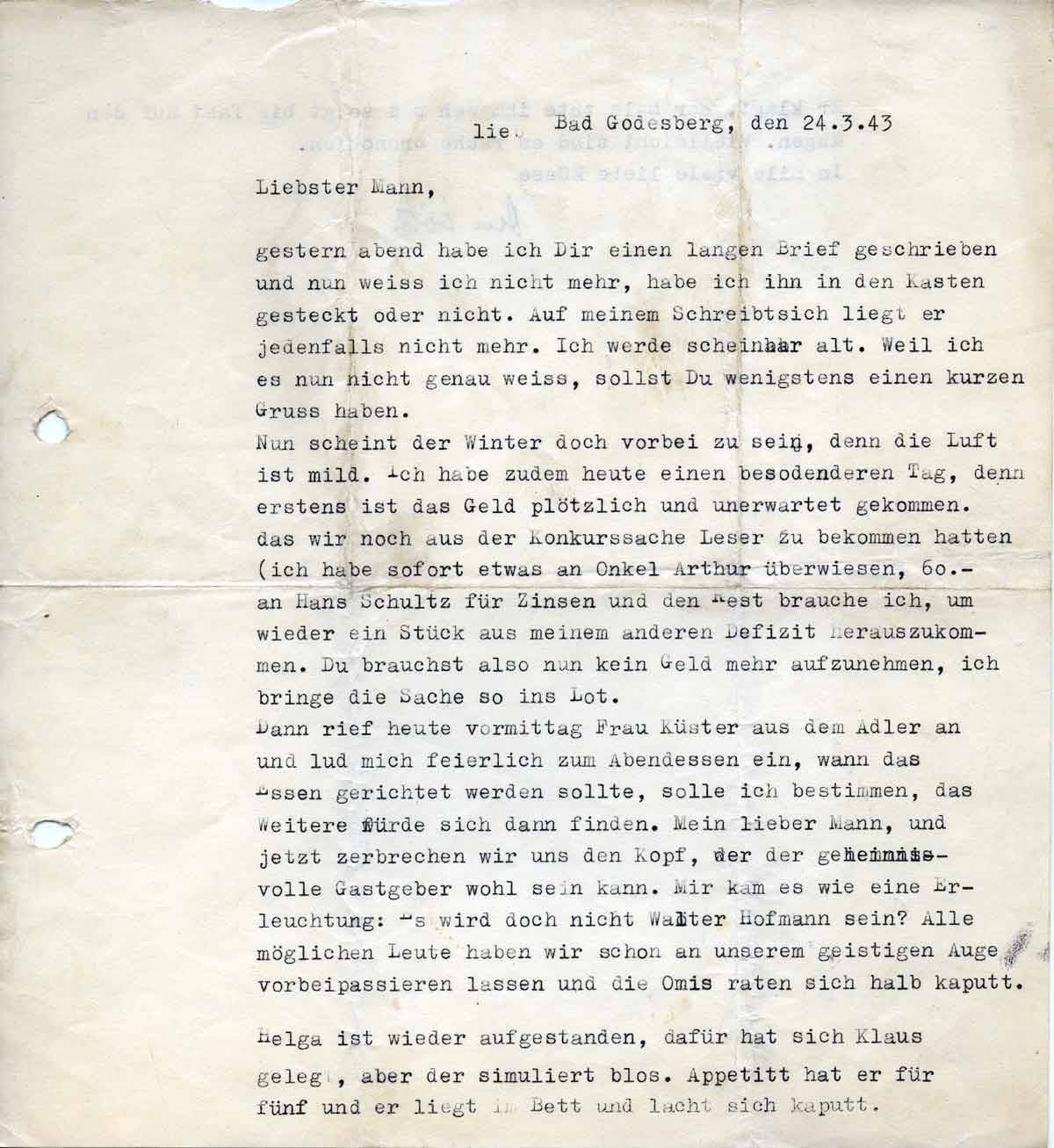 Nun scheint der Winter doch vorbei zu sein, denn die Luft ist mild. Ich habe heute einen besonderen Tag, denn erstens ist das Geld plötzlich und unerwartet gekommen, das wir noch aus der Konkurs-Sache Leser zu bekommen hatten (ich habe sofort etwas an Onkel Arthur überwiesen, 60.- and Hans Schultz für Zinsen und den Rest brauche ich, um wieder ein Stück aus meinem anderen Defizit herauszukommen. Du brauchst also nun kein Geld mehr aufzunehmen, ich bringe die Sache so ins Lot.