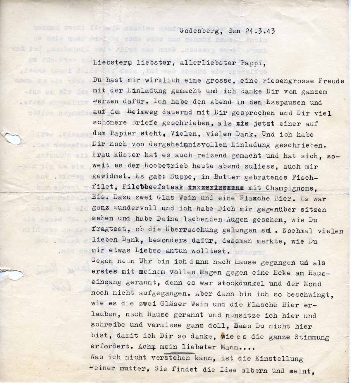 Du hast mir wirklich eine große, eine riesengroße Freude mit der Einladung gemacht, und ich danke Dir von ganzem Herzen dafür. Ich habe den Abend in den Esspausen und auf dem Heimweg dauernd mit Dir gesprochen und Dir viel schönere Briefe geschrieben, als jetzt einer auf dem Papier steht. Vielen, vielen Dank. Und ich habe Dir noch von der geheimnisvollen Einladung geschrieben!