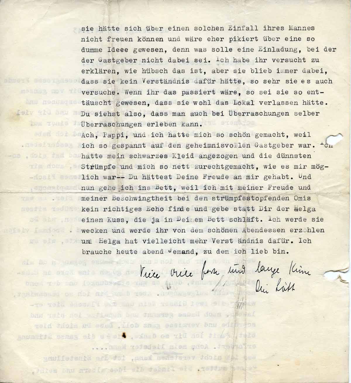 Ach, Pappi, und ich hatte mich so schön gemacht, hatte dein schwarzes Kleid angezogen und die dünnsten Strümpfe und mich so nett zurechtgemacht, wie es mir möglich war. Du hättest Deine Freude gehabt. Und nun gehe ich ins Bett, weil ich mit meiner Freude bei den strümpfestopfenden Omis kein richtiges Echo finde, und gebe statt Dir der Helga einen Kuss, die in Deinem Bett schläft. Ich werde sie wecken und ihr von dem schönen Abendessen erzählen, und Helga hat wahrscheinlich mehr Verständnis dafür. Ich brauche heute abend jemand, zu dem ich lieb bin.