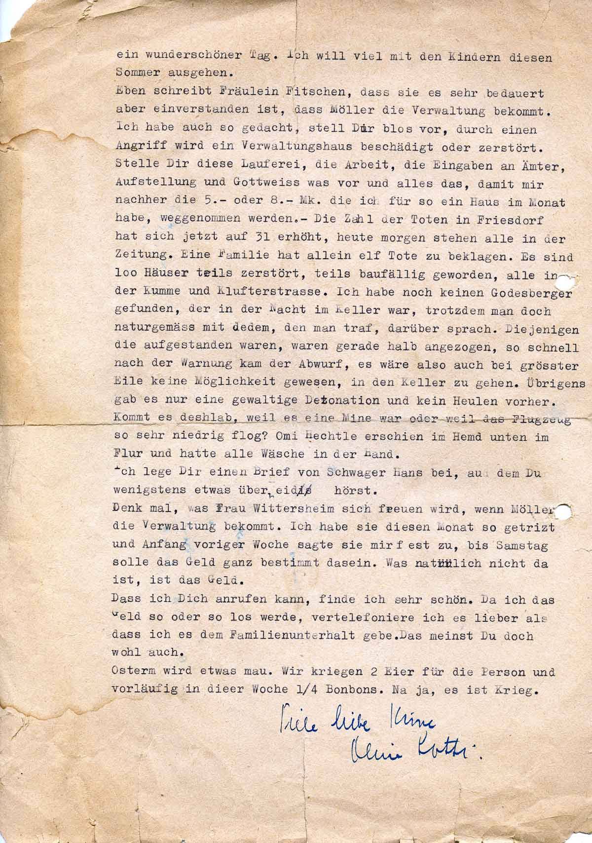 Die Zahl der Toten hat sich jetzt in Friesdorf auf 31 erhöht, heute morgen stehen alle in der Zeitung, eine Familie hat allein elf Tote zu beklagen. Es sind 100 Häuser teils zerstört, teils baufällig geworden, alle in der Kumme und der Klufterstraße. Ich habe noch keinen Godesberger gefunden, der in der Nacht im Keller war, trotzdem man doch naturgemäß mit jedem, den man traf, darüber sprach. Diejenigen, die aufgestanden waren, waren gerade halb angezogen, so schnell nach der Warnung kam der Abwurf, es wäre also auch bei größter Eile keine Möglichkeit gewesen, in den Keller zu gehen. Übrigens gab es nur eine gewaltige Detonation und kein Heulen vorher. Kommt es deshalb, weil es eine Mine war oder weil das Flugzeug so niedrig flog? Omi Hechtle erschien im Hemd unten im Flur und hatte alle Wäsche in der Hand. Ich lege Dir einen Brief von Schwager Hans bei, in dem Du wenigstens etwas über Heidi hörst.