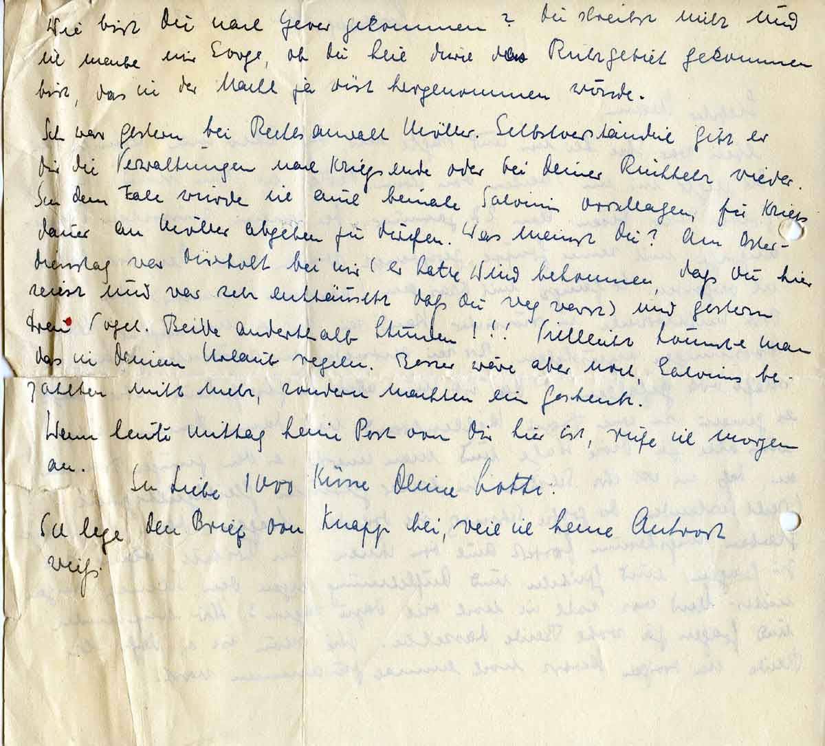 Ich war gestern bei Rechtsanwalt Möller. Selbstverständlich gibt er Dir die Verwaltungen nach Kriegsende wieder. In dem Fall würde ich auch beinahe die Verwaltung Salvini vorschlagen, für Kriegsdauer an Möller abgeben zu dürfen. Was meinst Du