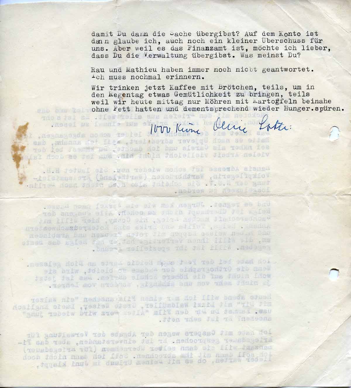 Ich habe mit Caspers wegen der Abgabe der Verwaltung für Kriegsdauer gesprochen. Er ist einverstanden, aber das Finanzamt will sie dann selber übernehmen (für Kriegsdauer) Ich soll dann mit ihm abrechnen. Soll ich dann nicht doch lieber warten, ob es mit Deinem Urlaub im Juni klappt,