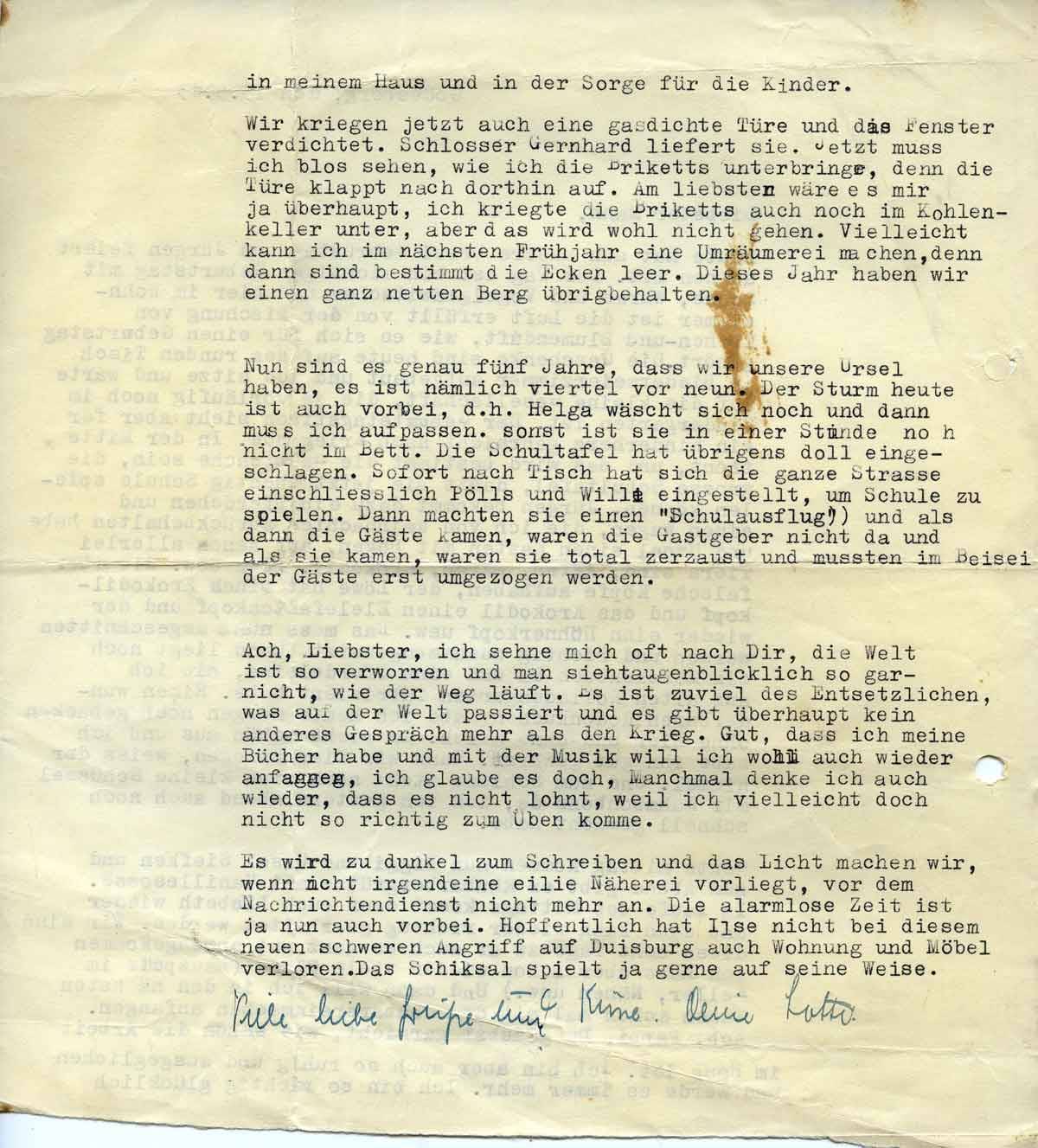 Es wird zu dunkel zum Schreiben, und das Licht machen wir, wenn nicht irgendeine eilige Näherei vorliegt, vor dem Nachrichtendienst nicht mehr an. Die alarmlose Zeit ist ja nun auch vorbei. Hoffentlich hat Ilse nicht bei diesem neuen schweren Angriff auf Duisburg auch Wohnung und Möbel verloren. Das Schicksal spielt ja gerne auf seine Weise.