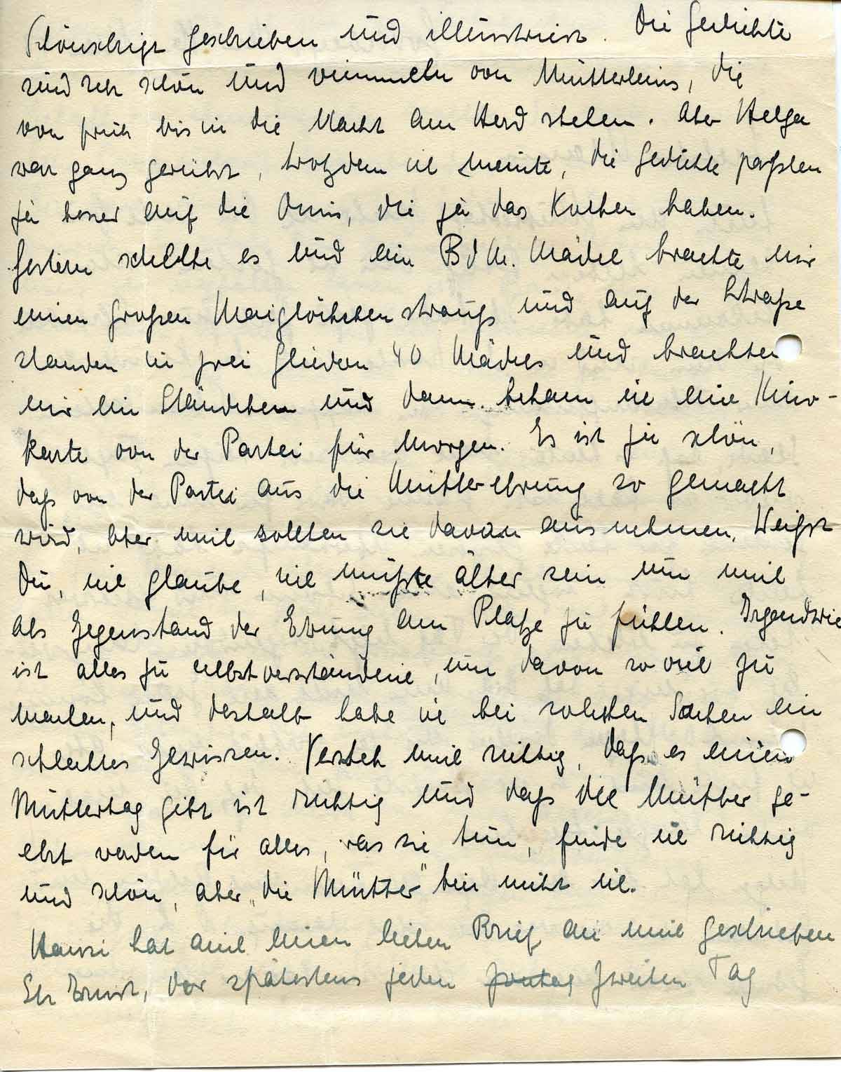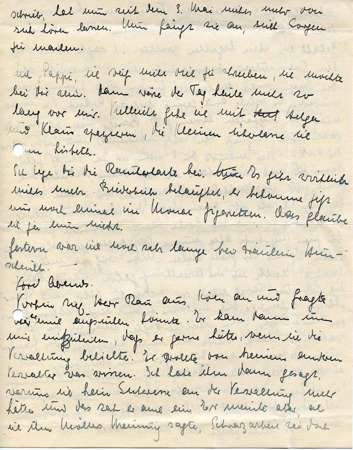 Ach, Pappi, ich weiß nicht viel zu schreiben, ich möchte bei Dir sein. Dann wäre der Tag heute nicht so lang vor mir. Vielleicht gehe ich mit Helga und Klaus spazieren, die Kleinen überlasse ich nun Lisbeth.