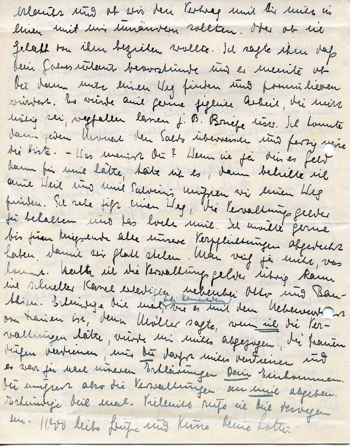 Erlaubt und ob wir den Vertrag mit Dir nicht in einen mit mir umändern sollten. Oder ob ich Gehalt von ihm beziehen wollte. Ich sagte ihm dass Dein Jahresurlaub bevorstünde und er meinte ob Du dann nicht einen Weg finden und formulieren würdest. Er würde auch gerne jegliche Arbeit, die nicht nötig sei, wegfallen lassen z.B. Briefe usw. Ich könnte dann jeden Monat den Saldo überweisen und fertig wäre die Kiste. – Was meinst Du? Wenn ich ja dieses Geld dann für mich hätte, täte ich es, dann behielte ich auch Weil und mit Salvinis müssten wir einen Weg finden. Ich sehe jetzt einen Weg, die Verwaltungsgelder zu behalten und das lockt mich. Ich möchte gerne bis zum Kriegsende alle unsere Verpflichtungen abgedeckt haben, damit wir glatt stehen. Man weiß ja nicht, was kommt. Halte ich die Verwaltungsgelder übrig kann ich schneller Kassel erledigen, nebenbei Otto und Banthien. Erkundige Dich mal bei den Kameraden, wie es mit dem Nebenverdienst von Frauen ist, denn Möller sagte, wenn ich die Verwaltungen hätte, würde mir nichts abgezogen, die Frauen dürfen verdienen, nur Du darfst nichts verdienen und es war ja nach unseren Erklärungen Dein Einkommen. Du müsstest also die Verwaltungen an mich abgeben. Erkundige Dich mal. Vielleicht rufe ich Dich deswegen an.