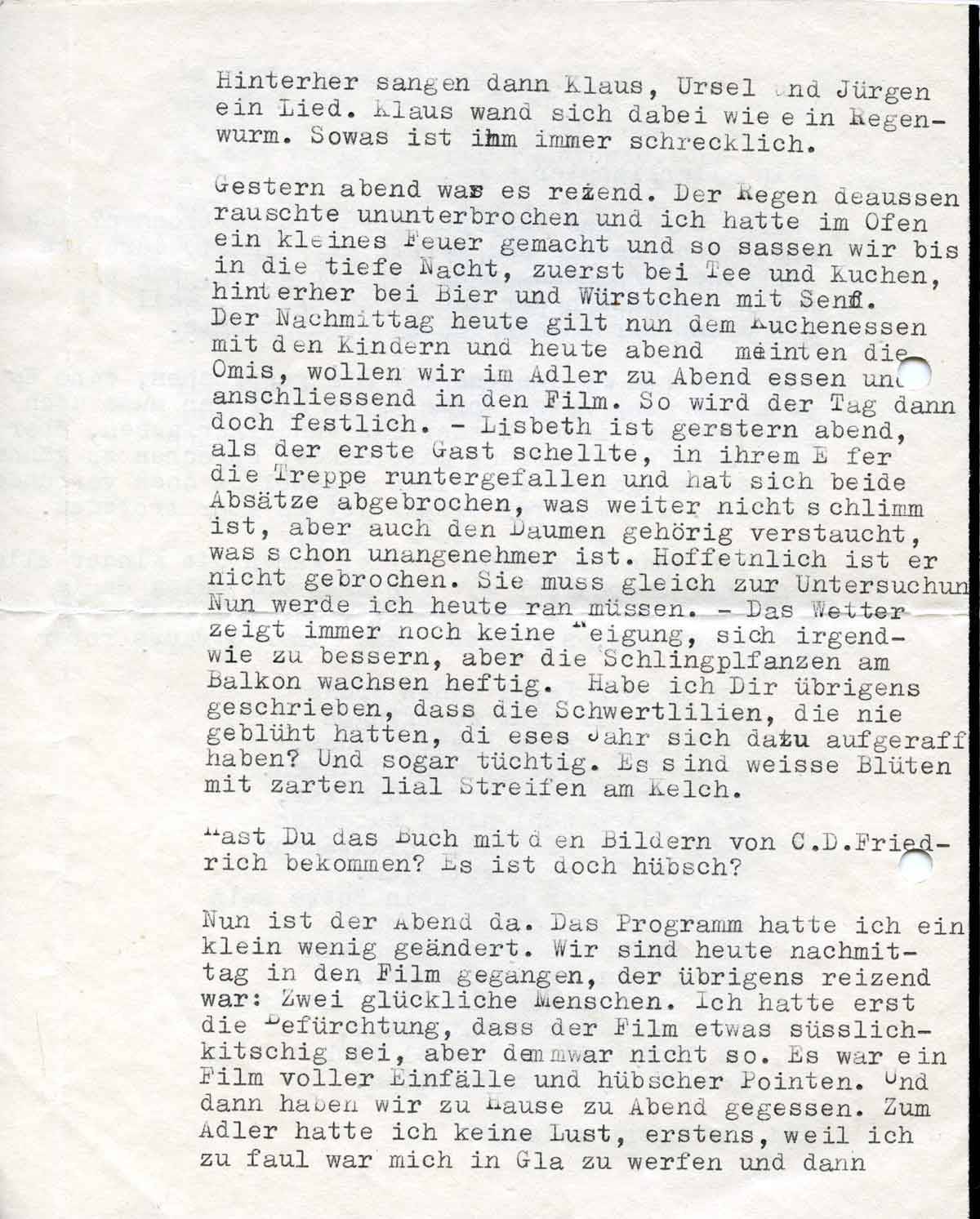 Lisbeth ist gestern, als der erste Gast, schellte, in ihrem Eifer die Treppe runtergefallen und hat sich beide Absätze abgebrochen, was weiter nicht schlimm ist, aber auch den Daumen gehörig verstaucht, was schon unangenehmer ist. Hoffentlich ist er nicht gebrochen. Sie muss gleich zur Untersuchung. Nun werde ich heute ran müssen. - Das Wetter zeigt immer noch keine Neigung, sich zu bessern, aber die Schlingpflanzen am Balkon wachsen heftig. Habe ich Dir übrigens schon geschrieben dass die Schwertlilien, die nie geblüht hatten, dieses Jahr sich dazu aufgerafft haben. Und sogar tüchtig. Es sind weiße Blüten mit zarten lila Streifen am Kelch. Hast Du das Buch mit den Bildern von C.D. Friedrich bekommen? Es ist doch hübsch?
