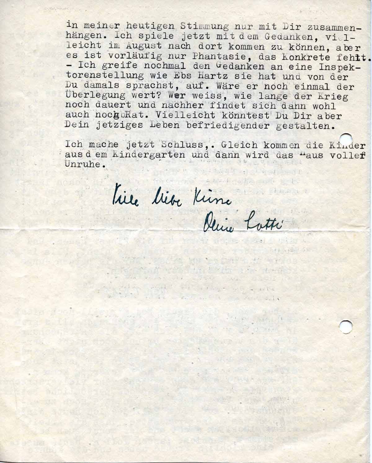 Ich greife noch mal den Gedanken an eine Inspektorenstelle wie Ebs Hartz sie hat und von der Du damals sprachst, auf. Wäre er noch einmal der Überlegung wert? Wer weiss, wie lange der Krieg noch dauert und nachher findet sich dann wohl auch noch Rat. Vielleicht könntest Du Dir aber Dein jetziges Leben befriedigender gestalten.