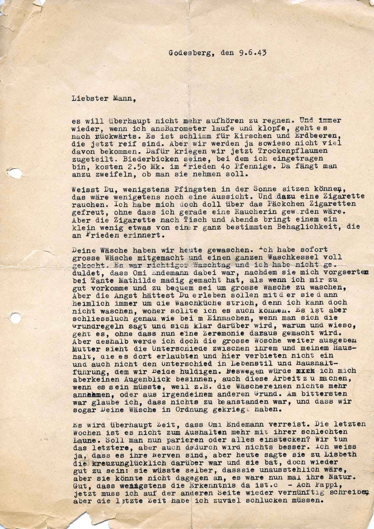 Charlotte Endemann an ihren Mann Harald, 9. Juni 1943