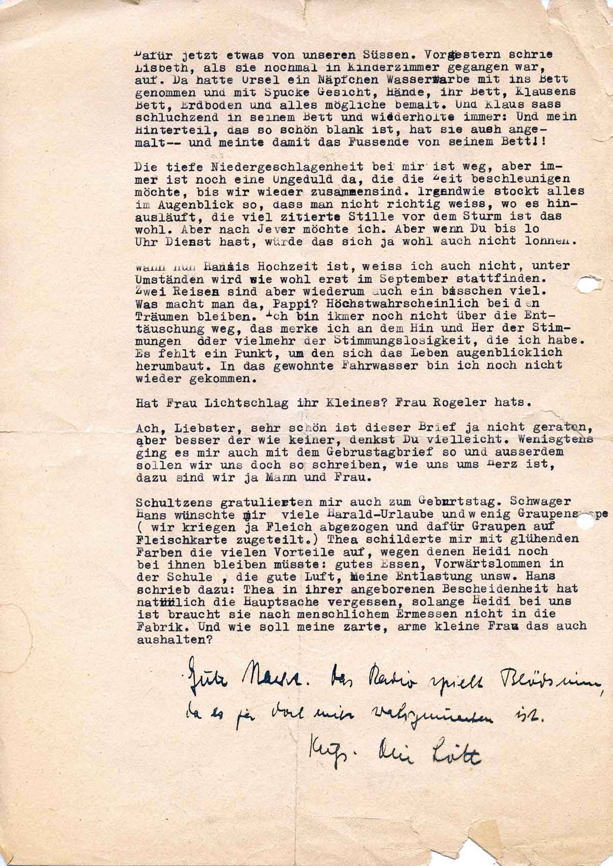 Schultzens gratulierten mir auch zum Geburtstag. Schwager Hans wünschte mir viele Harald-Urlaube und wenig Graupensuppe. (Wir kriegen ja Fleisch abgezogen und dafür Graupen auf Fleischkarte zugeteilt.) Thea schilderte mit glühenden Farben die vielen Vorteile, wegen denen Heidi noch bei ihnen bleiben müsste; gutes Essen, Vorwärtskommen in der Schule, die gute Luft, meine Entlastung usw. Hans schrieb dazu: Thea in ihrer angeborenen Bescheidenheit hat natürlich die Hauptsache vergessen, solange Heidi bei uns ist, braucht sie nach menschlichem Ermessen nicht in die Fabrik. Und wie soll meine zarte, kleine Frau das auch aushalten?