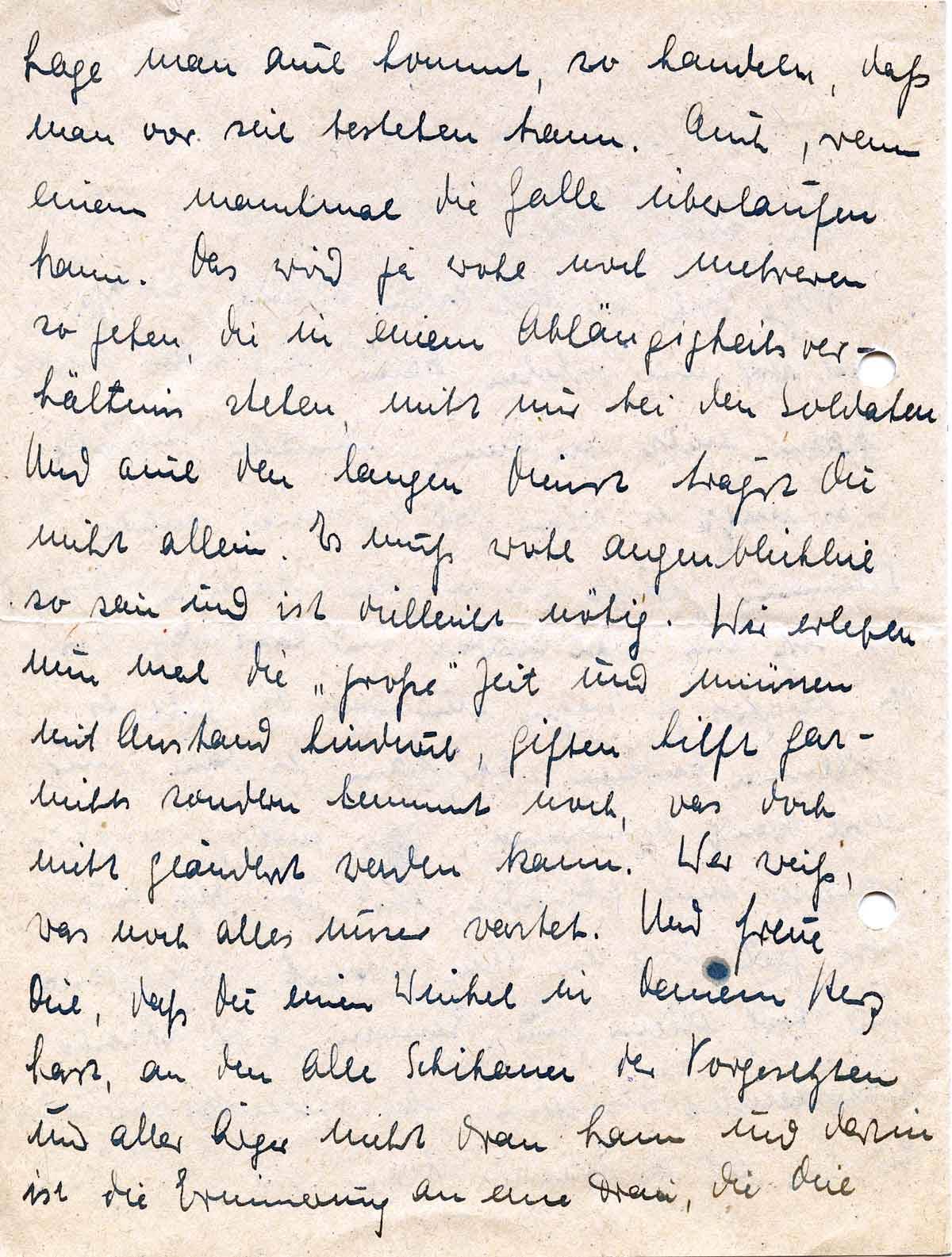 Sage doch einfach: Ich tue meine Pflicht, und alles andere kann nicht an meine inneren Bezirke. Was nützt es, wenn Du in eine solche Stimmung gerätst wie in dem heutigen Brief? Du bist nun mal Soldat und hast das Los des Landsers zu tragen, und wie Dir geht es Millionen anderen. Da kann es dann nur drauf ankommen, wie man sich persönlich damit abfindet und so, daß0 auch diese Zeit mit an ihm formt, trotzdem und trotz allem zum Besseren. -
