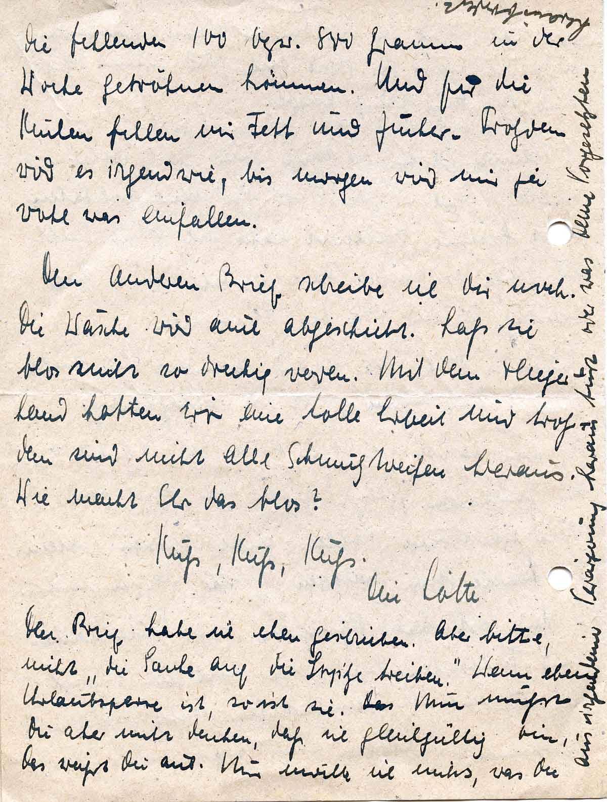Den anderen Brief schreibe ich Dir noch. Die Wäsche ist auch abgeschickt. Lass sie bloß nicht so dreckig werden. Mit dem Fliegerhemd hatten wir eine tolle Arbeit, und trotzdem sind nicht alle Schmutzstreifen raus. Wie macht Ihr das bloß?
