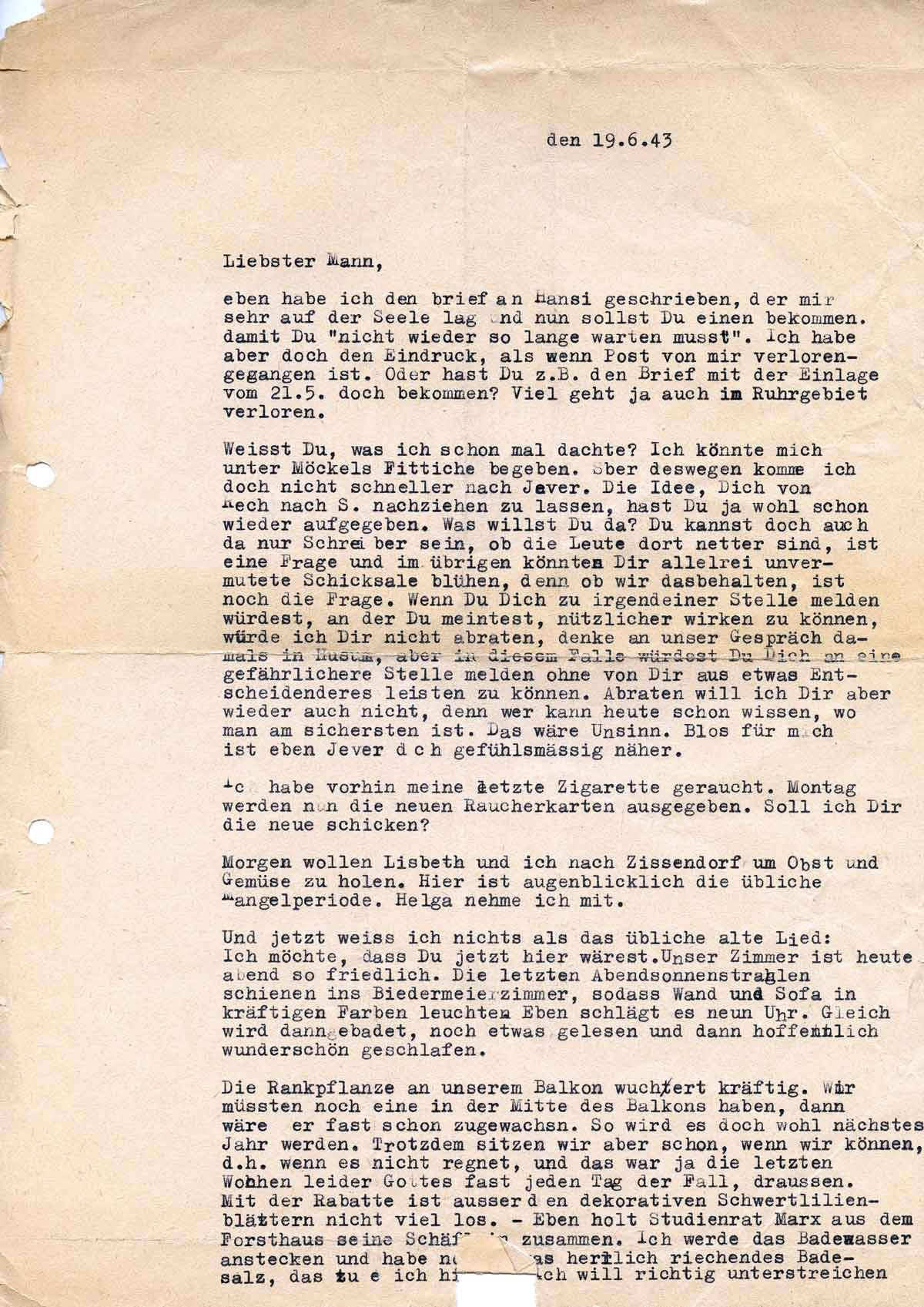 Charlotte Endemann an ihren Mann Harald, 19. Juni 1943